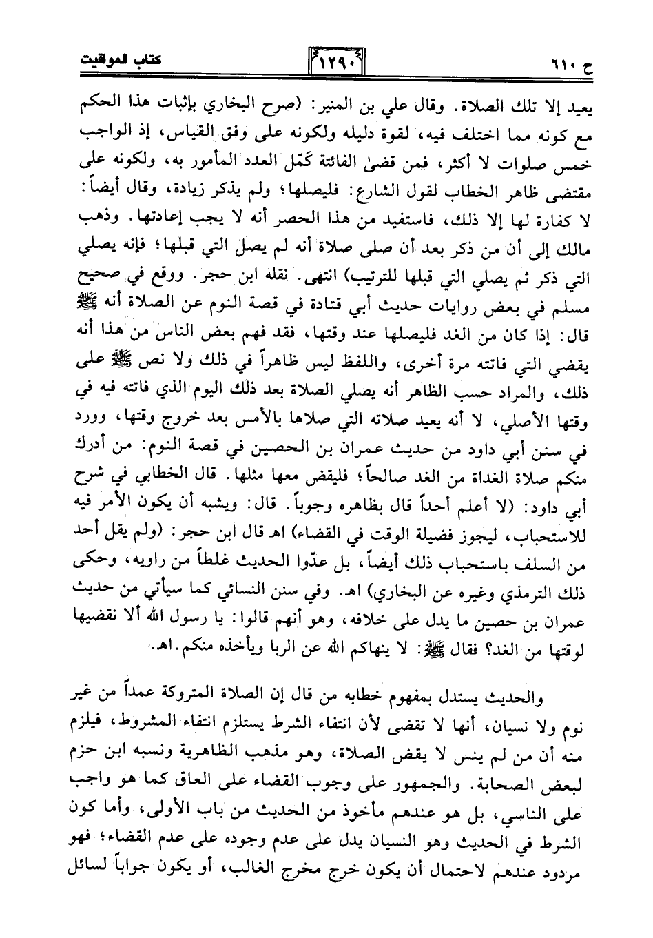 يعيد إلا تلك الصلاة. وقال علي بن المنير: (صرح البخاري بإثبات هذا الحكم مع كونه مما اختلف فيه، لقوة دليله ولكونه على وفق القياس، إذ الواجب خمس صلوات لا أكثر، فمن قضى الفائتة كَمّل العدد المأمور به، ولكونه على مقتضى ظاهر الخطاب لقول الشارع: فليصلها؛ ولم يذكر زيادة، وقال أيضًا: لا كفارة لها إلا ذلك، فاستفيد من هذا الحصر أنه لا يجب إعادتها. وذهب مالك إلى أن من ذكر بعد أن صلى صلاة أنه لم يصل التي قبلها؛ فإنه يصلي التي ذكر ثم يصلي التي قبلها للترتيب) انتهى. نقله ابن حجر. ووقع في صحيح مسلم في بعض روايات حديث أبي قتادة في قصة النوم عن الصلاة أنه - صلى الله عليه وسلم - قال: إذا كان من الغد فليصلها عند وقتها، فقد فهم بعض الناس من هذا أنه يقضي التي فاتته مرة أخرى، واللفظ ليس ظاهرًا في ذلك ولا نص - صلى الله عليه وسلم - على ذلك، والمراد حسب الظاهر أنه يصلي الصلاة بعد ذلك اليوم الذي فاتته فيه في وقتها الأصلي، لا أنه يعيد صلاته التي صلاها بالأمس بعد خروج وقتها، وورد في سنن أبي داود من حديث عمران بن الحصين في قصة النوم: من أدرك منكم صلاة الغداة من الغد صالحًا؛ فليقض معها مثلها. قال الخطابي في شرح أبي داود: إلا أعلم أحدًا قال بظاهره وجوبا. قال: ويشبه أن يكون الأمر فيه للاستحباب، ليجوز فضيلة الوقت في القضاء) اهـ قال ابن حجر: (ولم يقل أحد من السلف باستحباب ذلك أيضًا، بل عدّوا الحديث غلطًا من راويه، وحكى ذلك الترمذي وغيره عن البخاري) اهـ. وفي سنن النسائي كما سيأتي من حديث عمران بن حصين ما يدل على خلافه، وهو أنهم قالوا: يا رسول الله ألا نقضيها لوقتها من الغد؟ فقال - صلى الله عليه وسلم -: لا ينهاكم الله عن الربا ويأخذه منكم. اهـ.