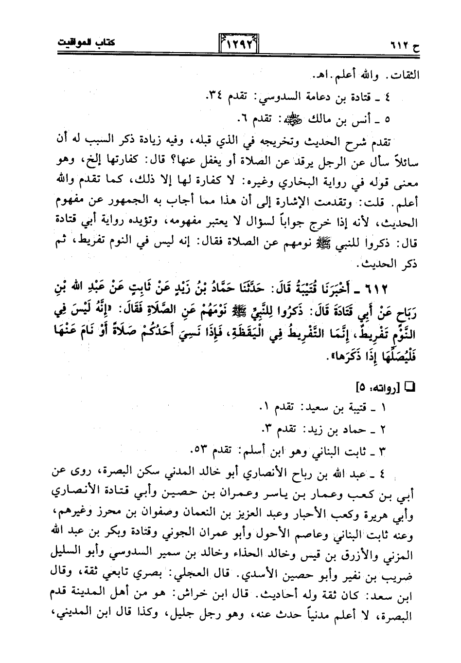 612 - أَخْبَرَنَا قُتَيْبَةُ قَالَ: حَدَّثَنَا حَمَّادُ بْنُ زَيْدٍ عَنْ ثَابِتٍ عَنْ عَبْدِ اللَّهِ بْنِ رَبَاحٍ عَنْ أَبِي قَتَادَةَ قَالَ: ذَكَرُوا لِلنَّبِيِّ - صلى الله عليه وسلم - نَوْمَهُمْ عَنِ الصَّلَاةِ فَقَالَ: "إِنَّهُ لَيْسَ فِي النَّوْمِ تَفْرِيطٌ، إِنَّمَا التَّفْرِيطُ فِي الْيَقَظَةِ، فَإِذَا نَسِيَ أَحَدُكُمْ صَلَاةً أَوْ نَامَ عَنْهَا فَلْيُصَلِّهَا إِذَا ذَكَرَهَا".