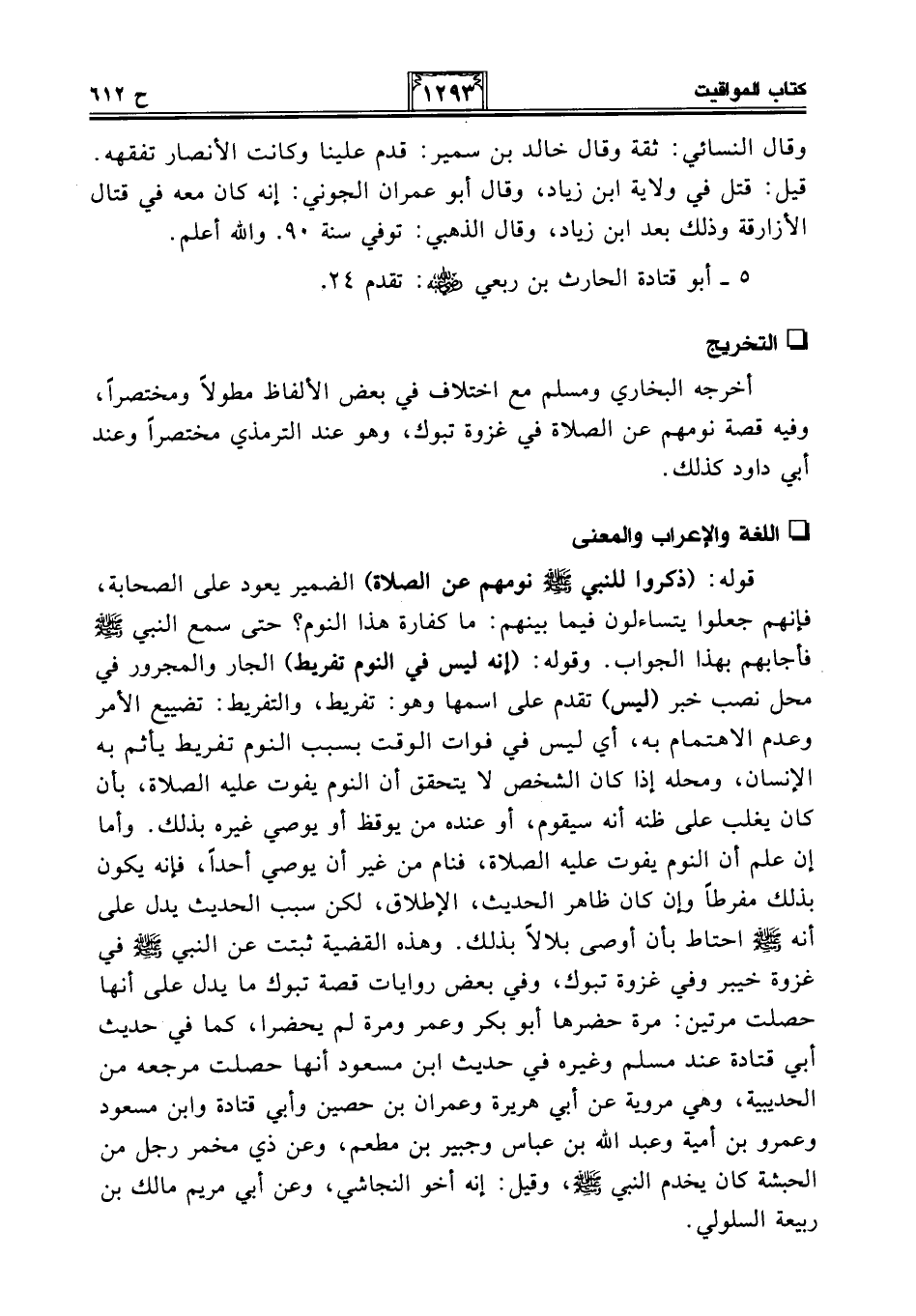 قوله: (ذكروا للنبي - صلى الله عليه وسلم - نومهم عن الصلاة) الضمير يعود على الصحابة، فإنهم جعلوا يتساءلون فيما بينهم: ما كفارة هذا النوم؟ حتى سمع النبي - صلى الله عليه وسلم - فأجابهم بهذا الجواب. وقوله: (إنه ليس في النوم تفريط) الجار والمجرور في محل نصب خبر (ليس) تقدم على اسمها وهو: تفريط، والتفريط: تضييع الأمر وعدم الاهتمام به، أي ليس في فوات الوقت بسبب النوم تفريط يأثم به الإنسان، ومحله إذا كان الشخص لا يتحقق أن النوم يفوت عليه الصلاة، بأن كان يغلب على ظنه أنه سيقوم، أو عنده من يوقظ أو يوصي غيره بذلك. وأما إن علم أن النوم يفوت عليه الصلاة، فنام من غير أن يوصي أحدًا، فإنه يكون بذلك مفرطًا وإن كان ظاهر الحديث، الإطلاق، لكن سبب الحديث يدل على أنه - صلى الله عليه وسلم - احتاط بأن أوصى بلالًا بذلك. وهذه القضية ثبتت عن النبي - صلى الله عليه وسلم - في غزوة خيبر وفي غزوة تبوك، وفي بعض روايات قصة تبوك ما يدل على أنها حصلت مرتين: مرة حضرها أبو بكر وعمر ومرة لم يحضرا، كما في حديث أبي قتادة عند مسلم وغيره في حديث ابن مسعود أنها حصلت مرجعه من الحديبية، وهي مروية عن أبي هريرة وعمران بن حصين وأبي قتادة وابن مسعود وعمرو بن أمية وعبد الله بن عباس وجبير بن مطعم، وعن ذي مخمر رجل من الحبشة كان يخدم النبي - صلى الله عليه وسلم -، وقيل: إنه أخو النجاشي، وعن أبي مريم مالك بن ربيعة السلولي.