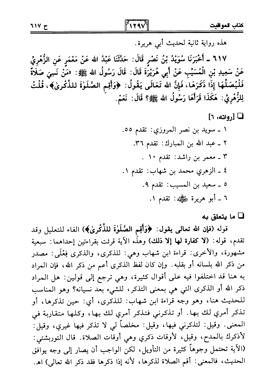 617 - أَخْبَرَنَا سُوَيْدُ بْنُ نَصْرٍ قَالَ: حَدَّثَنَا عَبْدُ اللَّهِ عَنْ مَعْمَرٍ عَنِ الزُّهْرِيِّ عَنْ سَعِيدِ بْنِ الْمُسَيَّبِ عن أبي هريرة قَالَ: قَالَ رَسُولُ اللَّهِ - صلى الله عليه وسلم -: "مَنْ نَسِيَ صَلَاةً فَلْيُصَلِّهَا إِذَا ذَكَرَهَا، فَإِنَّ اللَّهَ تَعَالَى يَقُولُ: {وَأَقِمِ الصَّلَاةَ لِذِكْرِي} "، قُلْتُ لِلزُّهْرِيِّ: هَكَذَا قَرَأَهَا رَسُولُ اللَّهِ - صلى الله عليه وسلم -؟ قَالَ: نَعَمْ.