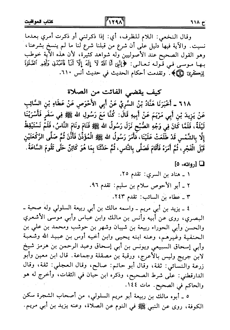 618 - أَخْبَرَنَا هَنَّادُ بْنُ السَّرِيِّ عَنْ أَبِي الأَحْوَصِ عَنْ عَطَاءِ بْنِ السَّائِبِ عَنْ يزيد بْنِ أَبِي مَرْيَمَ عَنْ أَبِيهِ قَالَ: كُنَّا مَعَ رَسُولِ اللَّهِ - صلى الله عليه وسلم - فِي سَفَرٍ فَأَسْرَيْنَا لَيْلَةً، فَلَمَّا كَانَ فِي وَجْهِ الصُّبْحِ نَزَلَ رَسُولُ اللَّهِ - صلى الله عليه وسلم - فَنَامَ وَنَامَ النَّاسُ، فَلَمْ نَسْتَيْقِظْ إِلَّا بِالشَّمْسِ قَدْ طَلَعَتْ عَلَيْنَا، فَأَمَرَ رَسُولُ اللَّهِ - صلى الله عليه وسلم - الْمُؤَذِّنَ فَأَذَّنَ ثُمَّ صَلَّى الرَّكْعَتَيْنِ قَبْلَ الْفَجْرِ، ثُمَّ أَمَرَهُ فَأَقَامَ فَصَلَّى بِالنَّاسِ، ثُمَّ حَدَّثَنَا بِمَا هُوَ كَائِنٌ حَتَّى تَقُومَ السَّاعَةُ.
