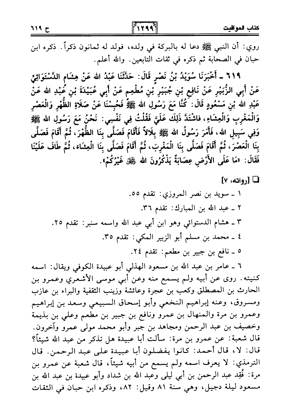619 - أَخْبَرَنَا سُوَيْدُ بْنُ نَصْرٍ قَالَ: حَدَّثَنَا عَبْدُ اللَّهِ عَنْ هِشَامٍ الدَّسْتَوَائِيِّ عَنْ أَبِي الزُّبَيْرِ عَنْ نَافِعِ بْنِ جُبَيْرِ بْنِ مُطْعِمٍ عَنْ أَبِي عُبَيْدَةَ بْنِ عَبْدِ اللَّهِ عَنْ عَبْدِ اللَّهِ بْنِ مَسْعُودٍ قَالَ: كُنَّا مَعَ رَسُولِ اللَّهِ - صلى الله عليه وسلم - فَحُبِسْنَا عَنْ صَلَاةِ الظُّهْرِ وَالْعَصْرِ وَالْمَغْرِبِ وَالْعِشَاءِ، فَاشْتَدَّ ذَلِكَ عَلَيَّ فَقُلْتُ فِي نَفْسِي: نَحْنُ مَعَ رَسُولِ اللَّهِ - صلى الله عليه وسلم - وَفِى سَبِيلِ اللَّهِ، فَأَمَرَ رَسُولُ اللَّهِ - صلى الله عليه وسلم - بِلَالًا فَأَقَامَ فَصَلَّى بِنَا الظُّهْرَ، ثُمَّ أَقَامَ فَصَلَّى بِنَا الْعَصْرَ، ثُمَّ أَقَامَ فَصَلَّى بِنَا الْمَغْرِبَ، ثُمَّ أَقَامَ فَصَلَّى بِنَا الْعِشَاءَ، ثُمَّ طَافَ عَلَيْنَا فَقَالَ: "مَا عَلَى الأَرْضِ عِصَابَةٌ يَذْكُرُونَ اللَّهَ -عَزَّ وَجَلَّ- غَيْرُكُمْ".
