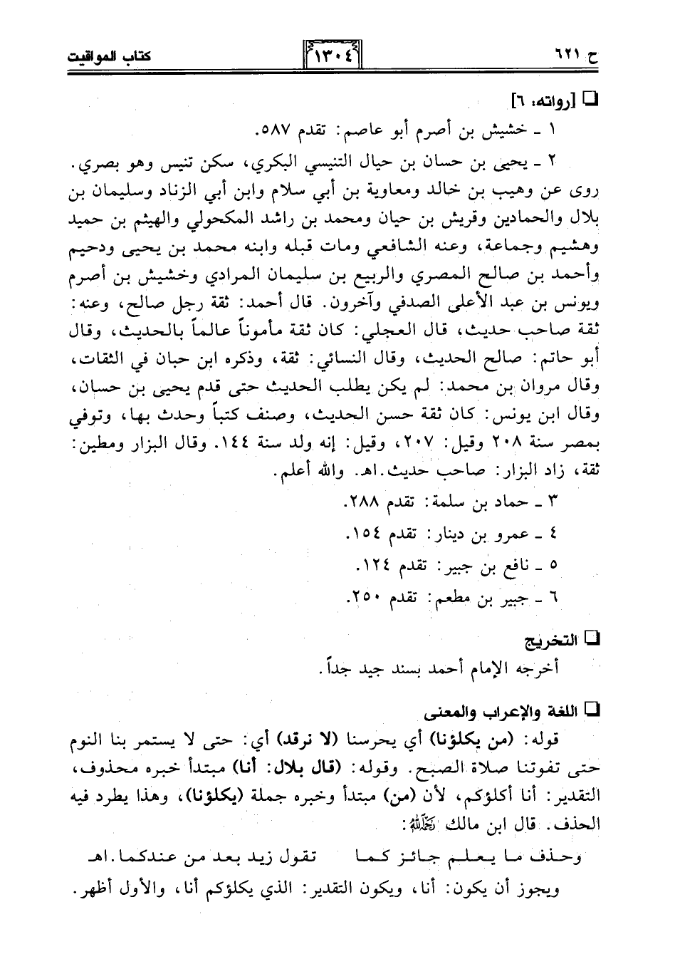 2 - يحيى بن حسان بن حيال التنيسي البكري، سكن تنيس وهو بصري. روى عن وهيب بن خالد ومعاوية بن أبي سلام وابن أبي الزناد وسليمان بن بلال والحمادين وقريش بن حيان ومحمد بن راشد المكحولي والهيثم بن حميد وهشيم وجماعة، وعنه الشافعي ومات قبله وابنه محمَّد بن يحيى ودحيم وأحمد بن صالح المصري والربيع بن سليمان المرادي وخشيش بن أصرم ويونس بن عبد الأعلى الصدفي وآخرون. قال أحمد: ثقة رجل صالح، وعنه: ثقة صاحب حديث، قال العجلي: كان ثقة مأمونًا عالمًا بالحديث، وقال أبو حاتم: صالح الحديث، وقال النسائي: ثقة، وذكره ابن حبان في الثقات، وقال مروان بن محمَّد: لم يكن يطلب الحديث حتى قدم يحيى بن حسان، وقال ابن يونس: كان ثقة حسن الحديث، وصنف كتبًا وحدث بها، وتوفي بمصر سنة 208 وقيل: 207، وقيل: إنه ولد سنة 144. وقال البزار ومطين: ثقة، زاد البزار: صاحب حديث. اهـ. والله أعلم.