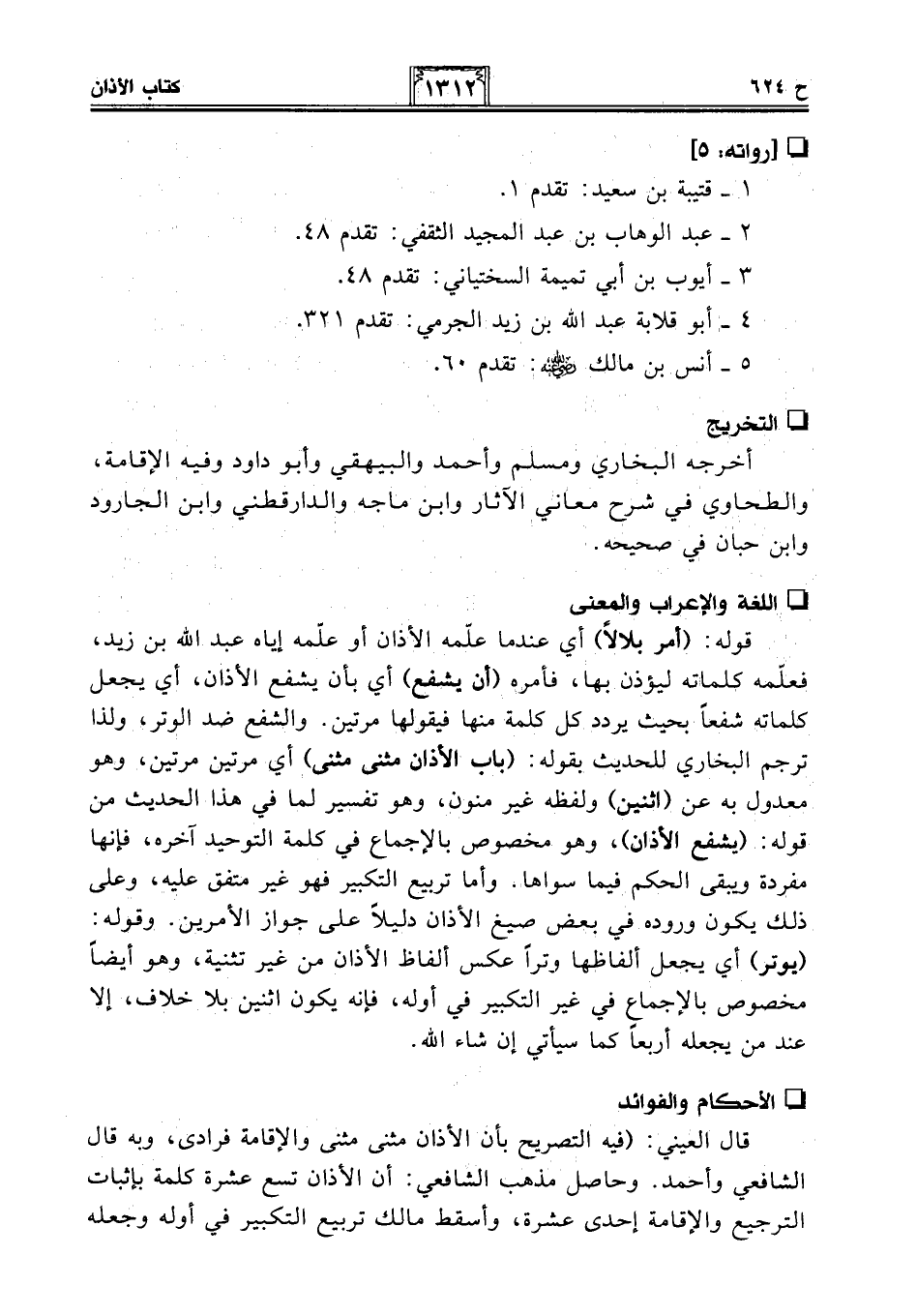 قال العيني: (فيه التصريح بأن الأذان مثنى مثنى والإقامة فرادى، وبه قال الشافعي وأحمد. وحاصل مذهب الشافعي: أن الأذان تسع عشرة كلمة بإثبات الترجيع والإقامة إحدى عشرة، وأسقط مالك تربيع التكبير في أوله وجعله