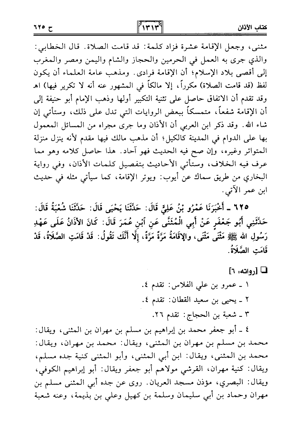 625 - أَخْبَرَنَا عَمْرُو بْنُ عَلِيٍّ قَالَ: حَدَّثَنَا يَحْيَى قَالَ: حَدَّثَنَا شُعْبَةُ قَالَ: حَدَّثَنِي أَبُو جَعْفَرٍ عَنْ أَبِي الْمُثَنَّى عَنِ ابْنِ عُمَرَ قَالَ: كَانَ الأَذَانُ عَلَى عَهْدِ رَسُولِ اللَّهِ - صلى الله عليه وسلم - مَثْنَى مَثْنَى، وَالإِقَامَةُ مَرَّةً مَرَّةً، إِلَّا أَنَّكَ تَقُولُ: قَدْ قَامَتِ الصَّلَاةُ، قَدْ قَامَتِ الصَّلَاةُ.