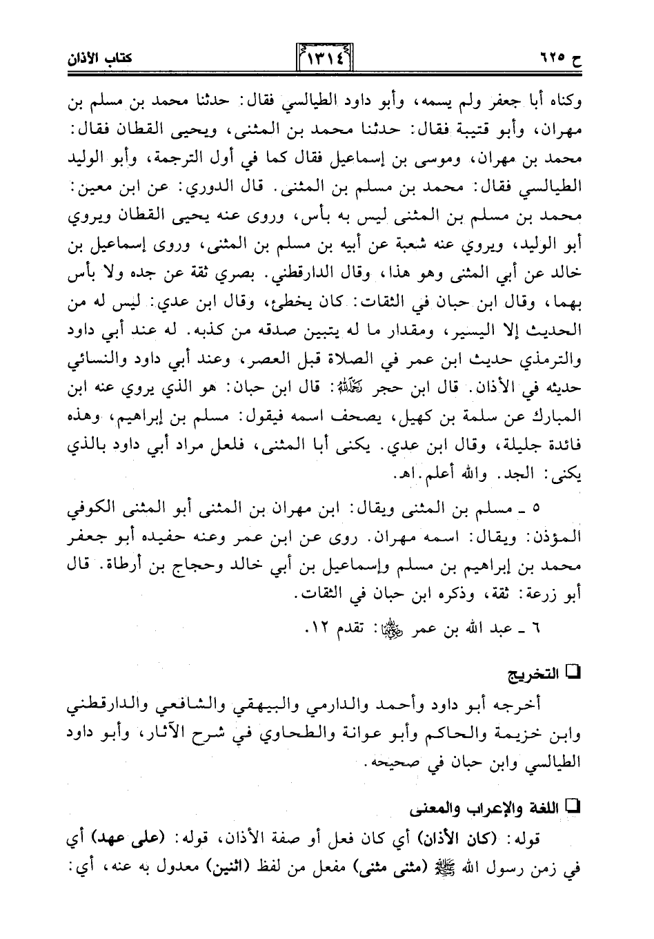 وكناه أبا جعفر ولم يسمه، وأبو داود الطيالسي فقال: حدثنا محمَّد بن مسلم بن مهران، وأبو قتيبة فقال: حدثنا محمَّد بن المثنى، ويحيى القطان فقال: محمَّد بن مهران، وموسى بن إسماعيل فقال كما في أول الترجمة، وأبو الوليد الطيالسي فقال: محمَّد بن مسلم بن المثنى. قال الدوري: عن ابن معين: محمَّد بن مسلم بن المثنى ليس به بأس، وروى عنه يحيى القطان ويروي أبو الوليد، ويروي عنه شعبة عن أبيه بن مسلم بن المثنى، وروى إسماعيل بن خالد عن أبي المثنى وهو هذا، وقال الدارقطني. بصري ثقة عن جده ولا بأس بهما، وقال ابن حبان في الثقات: كان يخطئ، وقال ابن عدي: ليس له من الحديث إلا اليسير، ومقدار ما له يتبين صدقه من كذبه. له عند أبي داود والترمذي حديث ابن عمر في الصلاة قبل العصر، وعند أبي داود والنسائي حديثه في الأذان. قال ابن حجر -رحمه الله-: قال ابن حبان: هو الذي يروي عنه ابن المبارك عن سلمة بن كهيل، يتصف اسمه فيقول: مسلم بن إبراهيم، وهذه فائدة جليلة، وقال ابن عدي. يكنى أبا المثنى، فلعل مراد أبي داود بالذي يكنى: الجد. والله أعلم. اهـ.