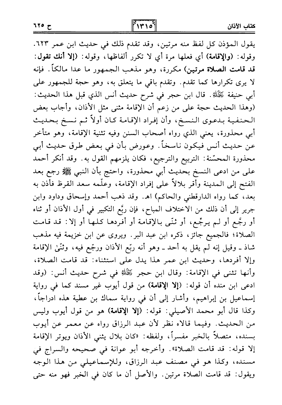 يقول المؤذن كل لفظ منه مرتين، وقد تقدم ذلك في حديث ابن عمر 623. وقوله: (والاقامة) أي فعلها مرة أي لا تكرر ألفاظها، وقوله: (إلا أنك تقول: قد قامت الصلاة مرتين) مكررة، وهو مذهب الجمهور ماعدا مالكًا. فإنه لا يرى تكرارها كما تقدم. وتقدم باقي ما يتعلق به، وهو حجة للجمهور على أبي حنيفة -رحمه الله-. قال ابن حجر في شرح حديث أنس الذي قبل هذا الحديث: (وهذا الحديث حجة على من زعم أن الإقامة مثنى مثل الأذان، وأجاب بعض الحنفية بدعوى النسخ، وأن إفراد الإقامة كان أولًا ثم نسخ بحديث أبي محذورة، يعني الذي رواه أصحاب السنن وفيه تثنية الإقامة، وهو متأخر عن حديث أنس فيكون ناسخًا. وعورض بأن في بعض طرق حديث أبي محذورة المحسّنة: التربيع والترجيع، فكان يلزمهم القول به. وقد أنكر أحمد على من ادعى النسخ بحديث أبي محذورة، واحتج بأن النبي - صلى الله عليه وسلم - رجع بعد الفتح إلى المدينة وأقر بلالًا على إفراد الإقامة، وعلّمه سعد القرظ فأذن به بعد، كما رواه الدارقطني والحاكم) اهـ. وقد ذهب أحمد وإسحاق وداود وابن جرير إلى أن ذلك من الاختلاف المباح، فإن ربع التكبير في أول الأذان أو ثناه أو رجَّع أو لم يرجِّع، أو ثنى بالإقامة أو أفردها كلها أو إلا: قد قامت الصلاة؛ فالجميع جائز، ذكره ابن عبد البر. ويروى عن ابن خزيمة فيه مذهب شاذ -وقيل إنه لم يقل به أحد- وهو أنه ربّع الأذان ورجّع فيه، وثنّى الإقامة وإلا أفردها، وحديث ابن عمر هذا يدل على استثناء: قد قامت الصلاة، وأنها تثنى في الإقامة: وقال ابن حجر -رحمه الله- في شرح حديث أنس: (وقد ادعى ابن منده أن قوله: (إلا الإقامة) من قول أيوب غير مسند كما في رواية إسماعيل بن إبراهيم، وأشار إلى أن في رواية سماك بن عطية هذه ادراجًا، وكذا قال أبو محمَّد الأصيلي: قوله: (إلا الإقامة) هو من قول أيوب وليس من الحديث. وفيما قالاه نظر لأن عبد الرزاق رواه عن معمر عن أيوب بسنده، متصلًا بالخبر مفسرًا، ولفظه: "كان بلال يثني الأذان ويوتر الإقامة إلا قوله: قد قامت الصلاة". وأخرجه أبو عوانة في صحيحه والسراج في مسنده، وكذا هو في مصنف عبد الرزاق، وللإسماعيلي من هذا الوجه ويقول: قد قامت الصلاة مرتين. والأصل أن ما كان في الخبر فهو منه حتى