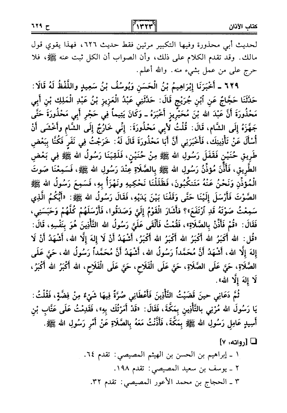 629 - أَخْبَرَنَا إِبْرَاهِيمُ بْنُ الْحَسَنِ وَيُوسُفُ بْنُ سَعِيدٍ وَاللَّفْظُ لَهُ قَالَا: حَدَّثَنَا حَجَّاجٌ عَنِ ابْنِ جُرَيْجٍ قَالَ: حَدَّثَنِي عَبْدُ الْعَزِيزِ بْنُ عَبْدِ الْمَلِكِ بْنِ أَبِي مَحْذُورَةَ أَنَّ عَبْدَ اللَّهِ بْنَ مُحَيْرِيزٍ أَخْبَرَهُ -وَكَانَ يَتِيمًا فِي حَجْرِ أَبِي مَحْذُورَةَ حَتَّى جَهَّزَهُ إِلَى الشَّامِ، قَالَ: قُلْتُ لأَبِي مَحْذُورَةَ: إِنِّي خَارِجٌ إِلَى الشَّامِ وَأَخْشَى أَنْ أُسْأَلَ عَنْ تَأْذِينِكَ، فَأَخْبَرَنِي أَنَّ أَبَا مَحْذُورَةَ قَالَ لَهُ: خَرَجْتُ فِي نَفَرٍ فَكُنَّا بِبَعْضِ طَرِيقِ حُنَيْنٍ فَقْفَلَ رَسُولِ اللَّهِ - صلى الله عليه وسلم - مِنْ حُنَيْنٍ، فَلَقِيَنَا رَسُولُ اللَّهِ - صلى الله عليه وسلم - فِي بَعْضِ الطَّرِيقِ، فَأَذَّنَ مُؤَذِّنُ رَسُولِ اللَّهِ - صلى الله عليه وسلم - بِالصَّلَاةِ عِنْدَ رَسُولِ اللَّهِ - صلى الله عليه وسلم -، فَسَمِعْنَا صَوْتَ الْمُؤَذِّنِ وَنَحْنُ عَنْهُ مُتَنَكِّبُونَ فَظَلَلْنَا نَحْكِيهِ وَنَهْزَأُ بِهِ، فَسَمِعَ رَسُولُ اللَّهِ - صلى الله عليه وسلم - الصَّوْتَ فَأَرْسَلَ إِلَيْنَا حَتَّى وَقَفْنَا بَيْنَ يَدَيْهِ، فَقَالَ رَسُولُ اللَّهِ - صلى الله عليه وسلم -: "أَيُّكُمُ الَّذِي سَمِعْتُ صَوْتَهُ قَدِ ارْتَفَعَ"؟ فَأَشَارَ الْقَوْمُ إِلَيَّ وَصَدَقُوا، فَأَرْسَلَهُمْ كُلَّهُمْ وَحَبَسَنِي، فَقَالَ: "قُمْ فَأَذِّنْ بِالصَّلَاةِ"، فَقُمْتُ فَأَلْقَى عَلَيَّ رَسُولُ اللَّهِ - صلى الله عليه وسلم - التَّأْذِينَ هُوَ بِنَفْسِهِ، قَالَ: "قُلِ: اللَّهُ أَكْبَرُ اللَّهُ أَكْبَرُ اللَّهُ أَكْبَرُ اللَّهُ أَكْبَرُ، أَشْهَدُ أَنْ لَا إِلَهَ إِلَّا اللَّهُ، أَشْهَدُ أَنْ لَا إِلَهَ إِلَّا اللَّهُ، أَشْهَدُ أَنَّ مُحَمَّدًا رَسُولُ اللَّهِ، أَشْهَدُ أَنَّ مُحَمَّدًا رَسُولُ اللَّهِ، حَيَّ عَلَى الصَّلَاةِ، حَيَّ عَلَى الصَّلَاةِ، حَيَّ عَلَى الْفَلَاحِ، حَيَّ عَلَى الْفَلَاحِ، اللَّهُ أَكْبَرُ اللَّهُ أَكْبَرُ، لَا إِلَهَ إِلَّا اللَّهُ".