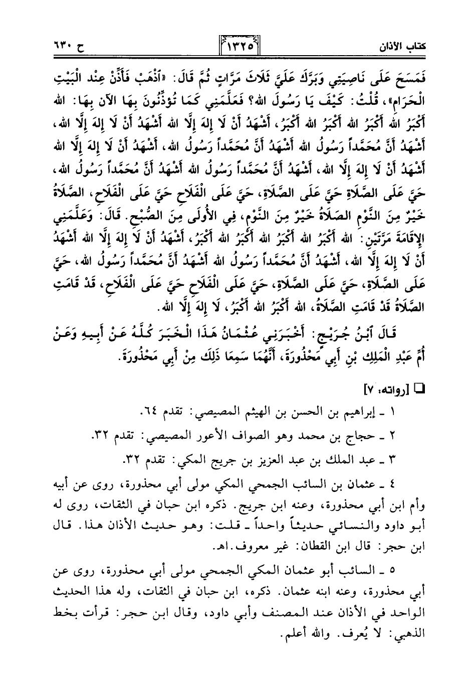5 - السائب أبو عثمان المكي الجمحي مولى أبي محذورة، روى عن أبي محذورة، وعنه ابنه عثمان. ذكره، ابن حبان في الثقات، وله هذا الحديث الواحد في الأذان عند المصنف وأبي داود، وقال ابن حجر: قرأت بخط الذهبي: لا يُعرف. والله أعلم.