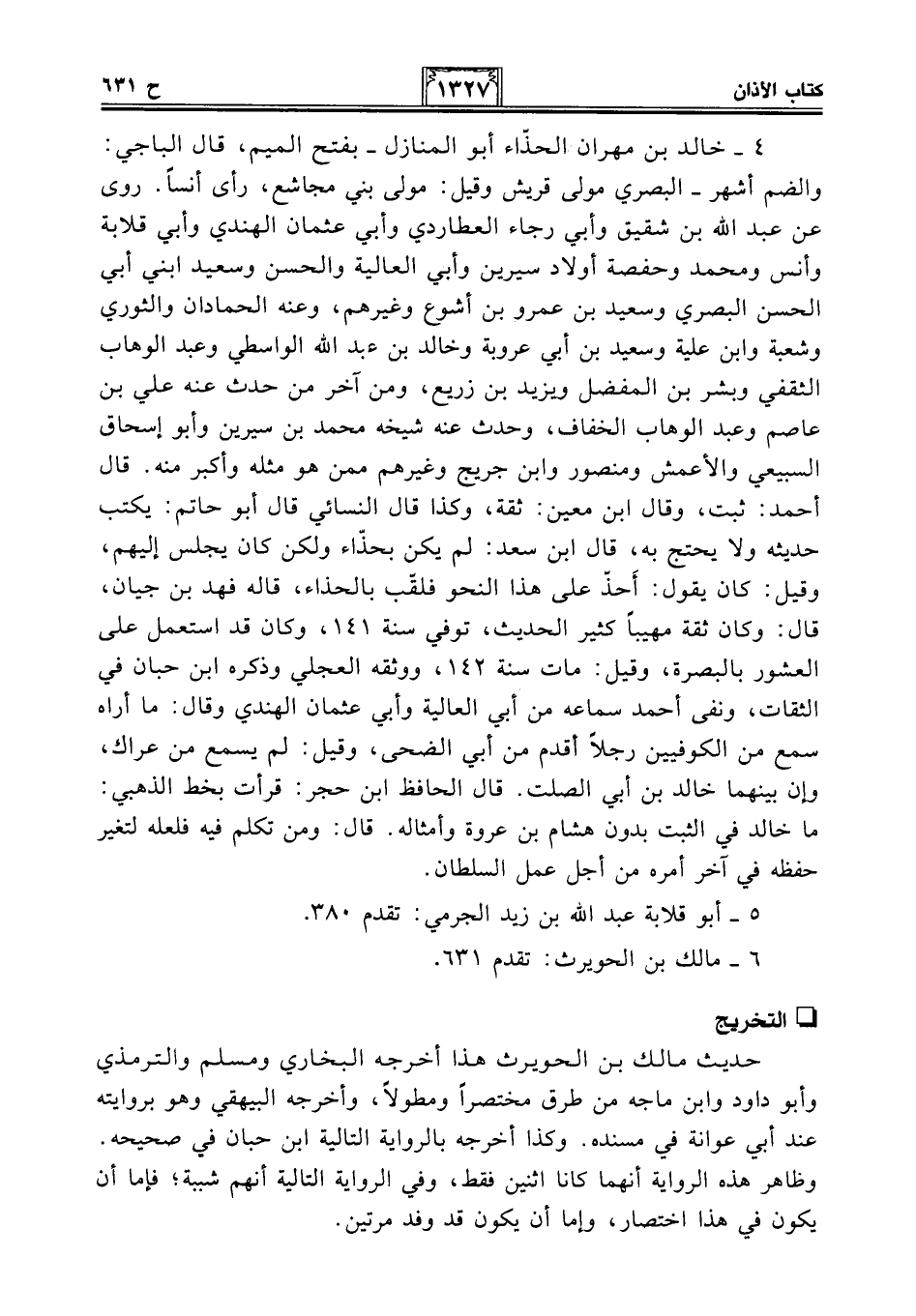 4 - خالد بن مهران الحذّاء أبو المنازل -بفتح الميم، قال الباجي: والضم أشهر- البصري مولى قريش وقيل: مولى بني مجاشع، رأى أنسًا. روى عن عبد الله بن شقيق وأبي رجاء العطاردي وأبي عثمان الهندي وأبي قلابة وأنس ومحمد وحفصة أولاد سيرين وأبي العالية والحسن وسعيد ابني أبي الحسن البصري وسعيد بن عمرو بن أشوع وغيرهم، وعنه الحمادان والثوري وشعبة وابن علية وسعيد بن أبي عروبة وخالد بن عبد الله الواسطي وعبد الوهاب الثقفي وبشر بن المفضل ويزيد بن زريع، ومن آخر من حدث عنه علي بن عاصم وعبد الوهاب الخفاف، وحدث عنه شيخه محمَّد بن سيرين وأبو إسحاق السبيعي والأعمش ومنصور وابن جريج وغيرهم ممن هو مثله وأكبر منه. قال أحمد: ثبت، وقال ابن معين: ثقة، وكذا قال النسائي قال أبو حاتم: يكتب حديثه ولا يحتج به، قال ابن سعد: لم يكن بحذّاء ولكن كان يجلس إليهم، وقيل: كان يقول: أَحذّ على هذا النحو فلقب بالحذاء، قاله فهد بن جيان، قال: وكان ثقة مهيبًا كثير الحديث، توفي سنة 141، وكان قد استعمل على العشور بالبصرة، وقيل: مات سنة 142، ووثقه العجلي وذكره ابن حبان في الثقات، ونفى أحمد سماعه من أبي العالية وأبي عثمان الهندي وقال: ما أراه سمع من الكوفيين رجلًا أقدم من أبي الضحى، وقيل: لم يسمع من عراك، وإن بينهما خالد بن أبي الصلت. قال الحافظ ابن حجر: قرأت بخط الذهبي: ما خالد في الثبت بدون هشام بن عروة وأمثاله. قال: ومن تكلم فيه فلعله لتغير حفظه في آخر أمره من أجل عمل السلطان.