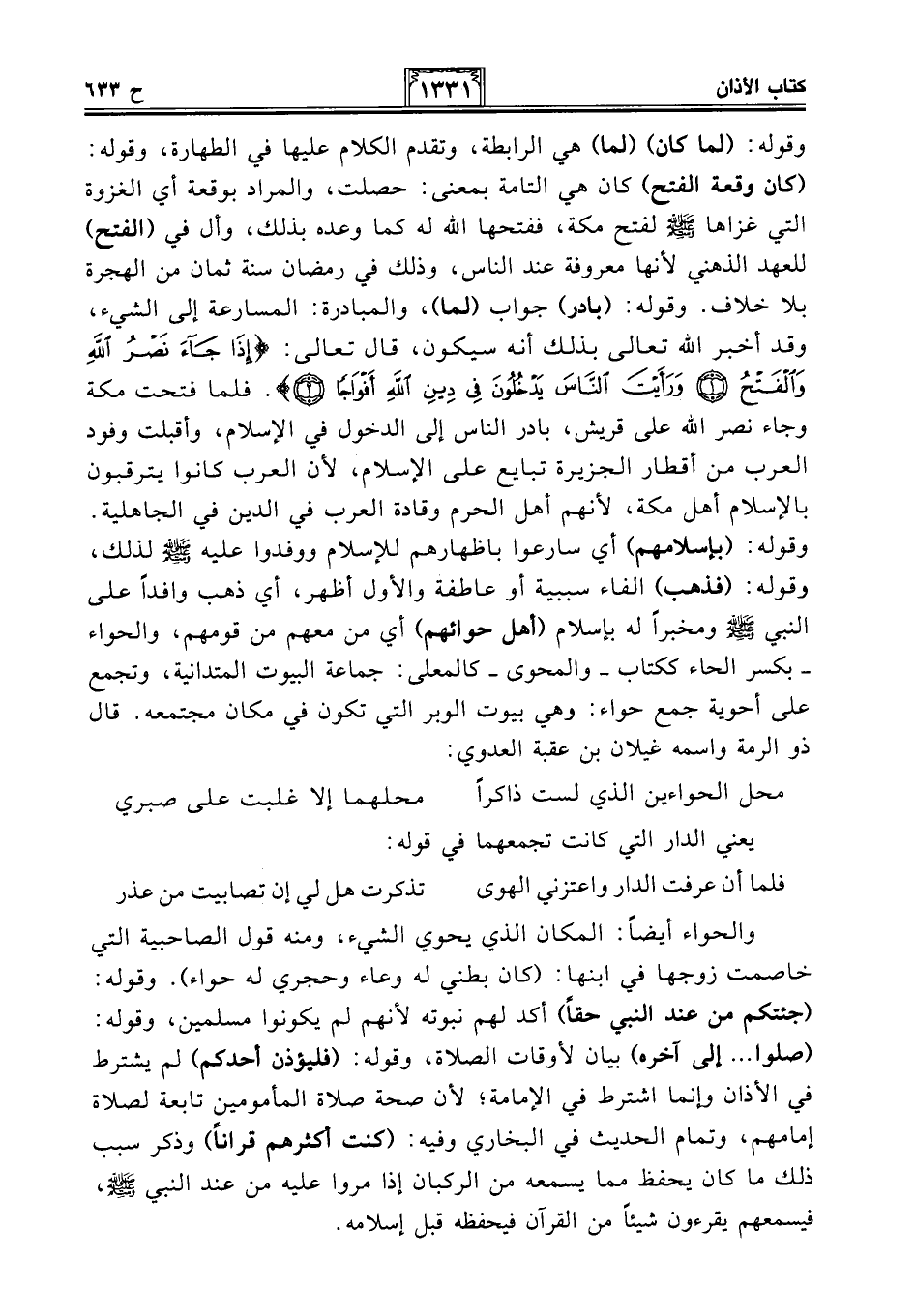 وقوله: (لما كان) (لما) هي الرابطة، وتقدم الكلام عليها في الطهارة، وقوله: (كان وقعة الفتح) كان هي التامة بمعنى: حصلت، والمراد بوقعة أي الغزوة التي غزاها - صلى الله عليه وسلم - لفتح مكة، ففتحها الله له كما وعده بذلك، وأل في (الفتح) للعهد الذهني لأنها معروفة عند الناس، وذلك في رمضان سنة ثمان من الهجرة بلا خلاف. وقوله: (بادر) جواب (لما)، والمبادرة: المسارعة إلى الشيء، وقد أخبر الله تعالى بذلك أنه سيكون، قال تعالى: {إِذَا جَاءَ نَصْرُ اللَّهِ وَالْفَتْحُ (1) وَرَأَيْتَ النَّاسَ يَدْخُلُونَ فِي دِينِ اللَّهِ أَفْوَاجًا (2)}. فلما فتحت مكة وجاء نصر الله على قريش، بادر الناس إلى الدخول في الإِسلام، وأقبلت وفود العرب من أقطار الجزيرة تبايع على الإِسلام، لأن العرب كانوا يترقبون بالإِسلام أهل مكة، لأنهم أهل الحرم وقادة العرب في الدين في الجاهلية. وقوله: (بإسلامهم) أي سارعوا بإظهارهم للإسلام ووفدوا عليه - صلى الله عليه وسلم - لذلك، وقوله: (فذهب) الفاء سببية أو عاطفة والأول أظهر، أي ذهب وافدًا على النبي - صلى الله عليه وسلم - ومخبرًا له بإسلام (أهل حوائهم) أي من معهم من قومهم، والحواء -بكسر الحاء ككتاب- والمحوى -كالمعلى: جماعة البيوت المتدانية، وتجمع على أحوية جمع حواء: وهي بيوت الوبر التي تكون في مكان مجتمعه. قال ذو الرمة واسمه غيلان بن عقبة العدوي: