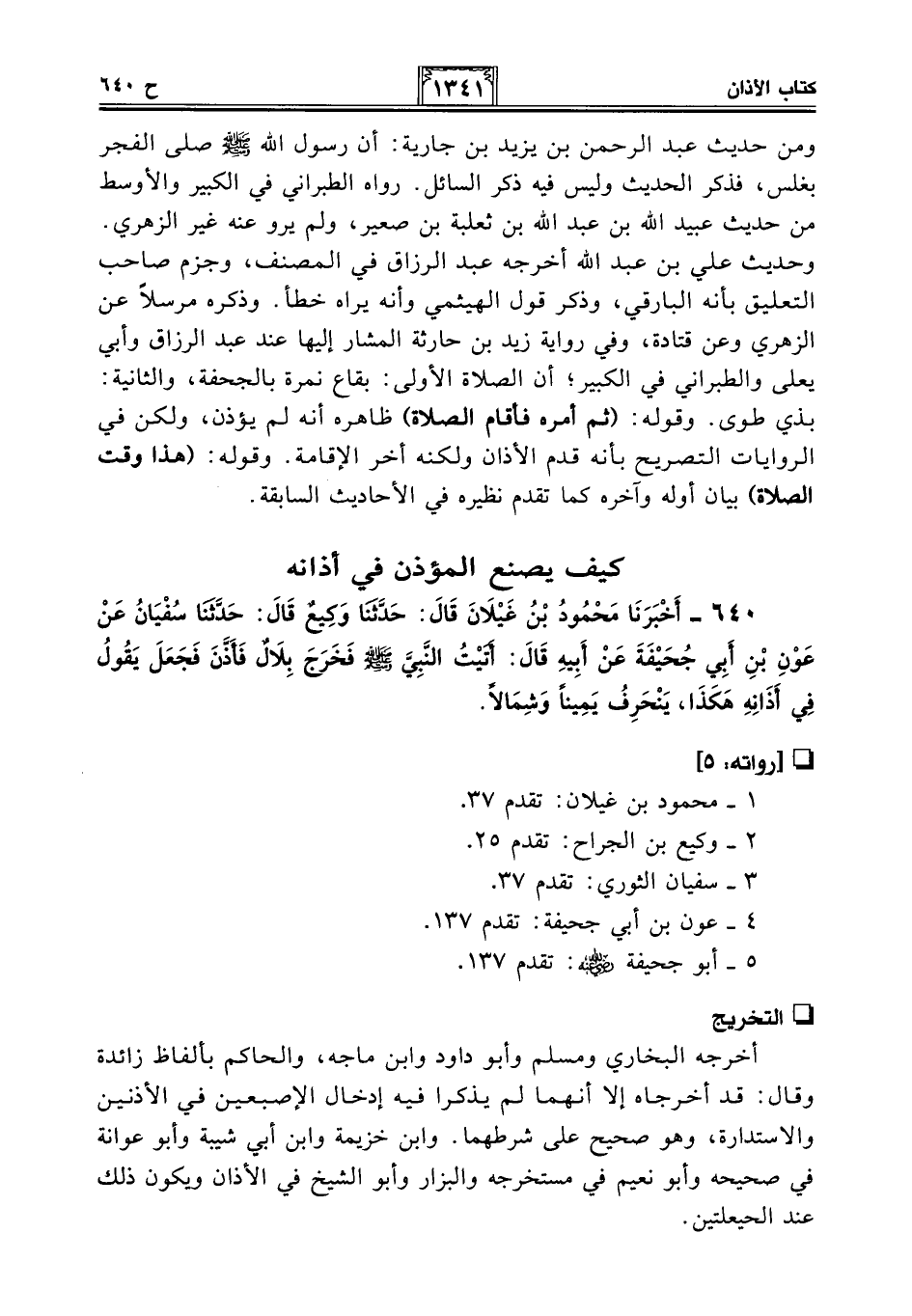 أخرجه البخاري ومسلم وأبو داود وابن ماجه، والحاكم بألفاظ زائدة وقال: قد أخرجاه إلا أنهما لم يذكرا فيه إدخال الإصبعين في الأذنين والاستدارة، وهو صحيح على شرطهما. وابن خزيمة وابن أبي شيبة وأبو عوانة في صحيحه وأبو نعيم في مستخرجه والبزار وأبو الشيخ في الأذان ويكون ذلك عند الحيعلتين.