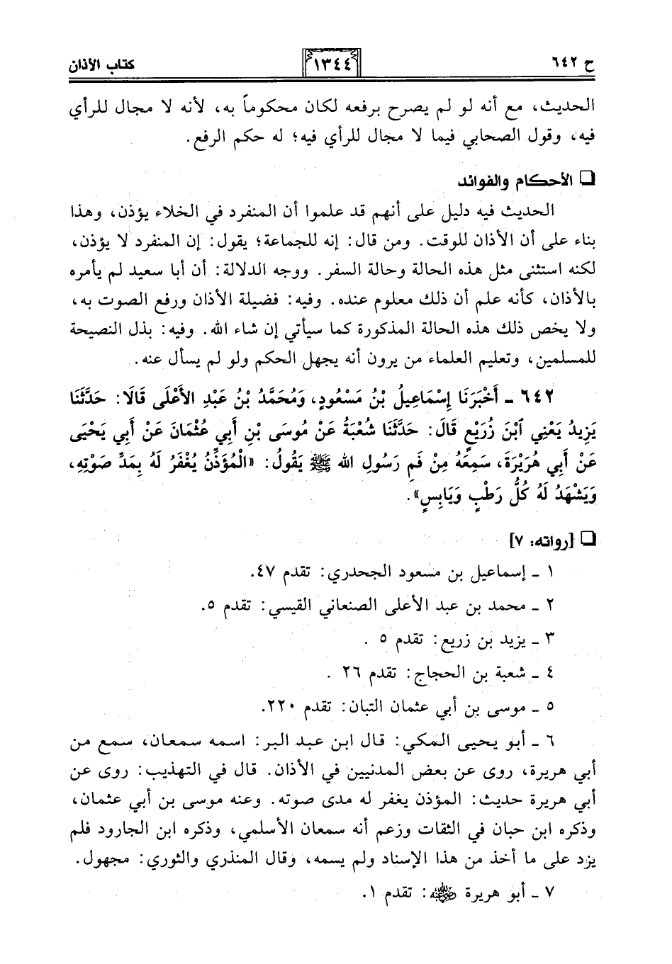 642 - أَخْبَرَنَا إِسْمَاعِيلُ بْنُ مَسْعُودٍ، وَمُحَمَّدُ بْنُ عَبْدِ الأَعْلَى قَالَا: حَدَّثَنَا يَزِيدُ يَعْنِي ابْنَ زُرَيْعٍ قَالَ: حَدَّثَنَا شُعْبَةُ عَنْ مُوسَى بْنِ أَبِي عُثْمَانَ عَنْ أَبِي يَحْيَى عَنْ أَبِي هُرَيْرَةَ، سَمِعَهُ مِنْ فَمِ رَسُولِ اللَّهِ - صلى الله عليه وسلم - يَقُولُ: "الْمُؤَذِّنُ يُغْفَرُ لَهُ بِمَدِّ صَوْتِهِ، وَيَشْهَدُ لَهُ كُلُّ رَطْبٍ وَيَابِسٍ".
