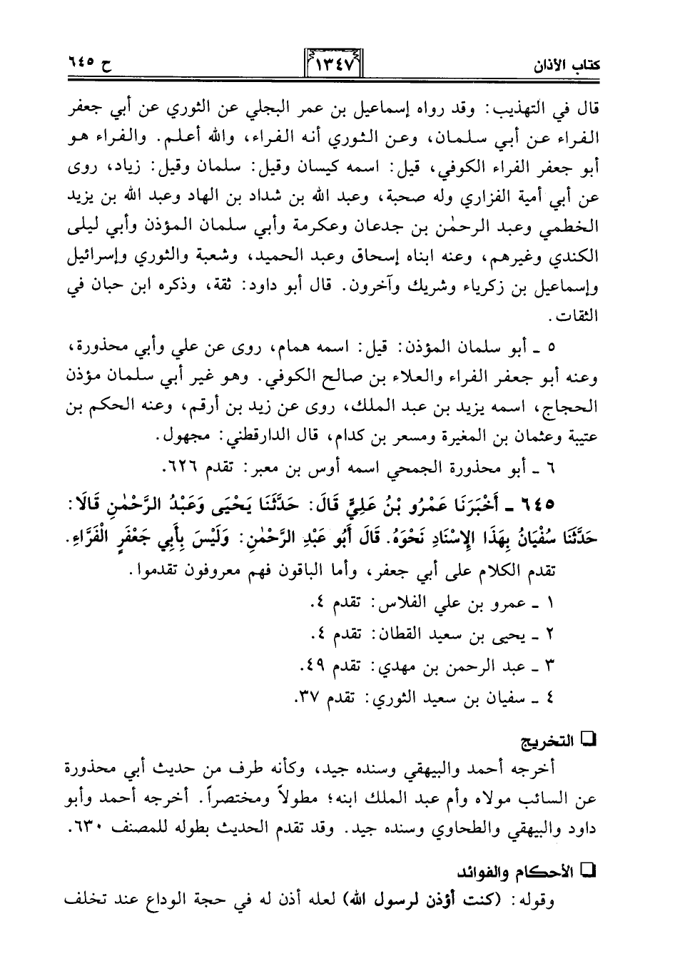 أخرجه أحمد والبيهقي وسنده جيد، وكأنه طرف من حديث أبي محذورة عن السائب مولاه وأم عبد الملك ابنه؛ مطولًا ومختصرًا. أخرجه أحمد وأبو داود والبيهقي والطحاوي وسنده جيد. وقد تقدم الحديث بطوله للمصنف 630.