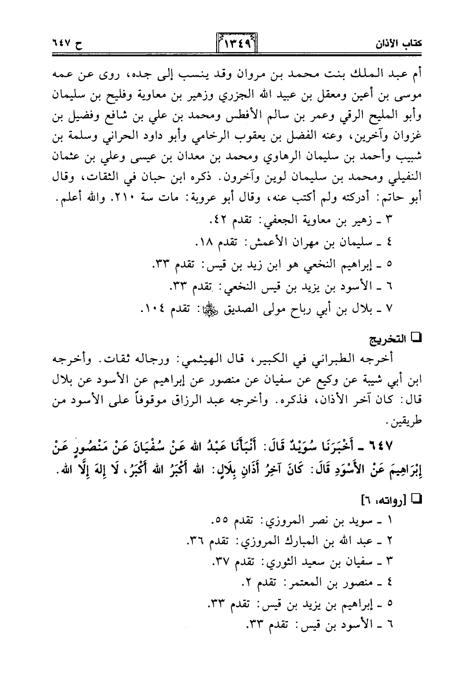 647 - أَخْبَرَنَا سُوَيْدٌ قَالَ: أَنْبَأَنَا عَبْدُ اللَّهِ عَنْ سُفْيَانَ عَنْ مَنْصُورٍ عَنْ إِبْرَاهِيمَ عَنِ الأَسْوَدِ قَالَ: كَانَ آخِرُ أَذَانِ بِلَالٍ: اللَّهُ أَكْبَرُ اللَّهُ أَكْبَرُ، لَا إِلَهَ إِلَّا اللَّهُ.
