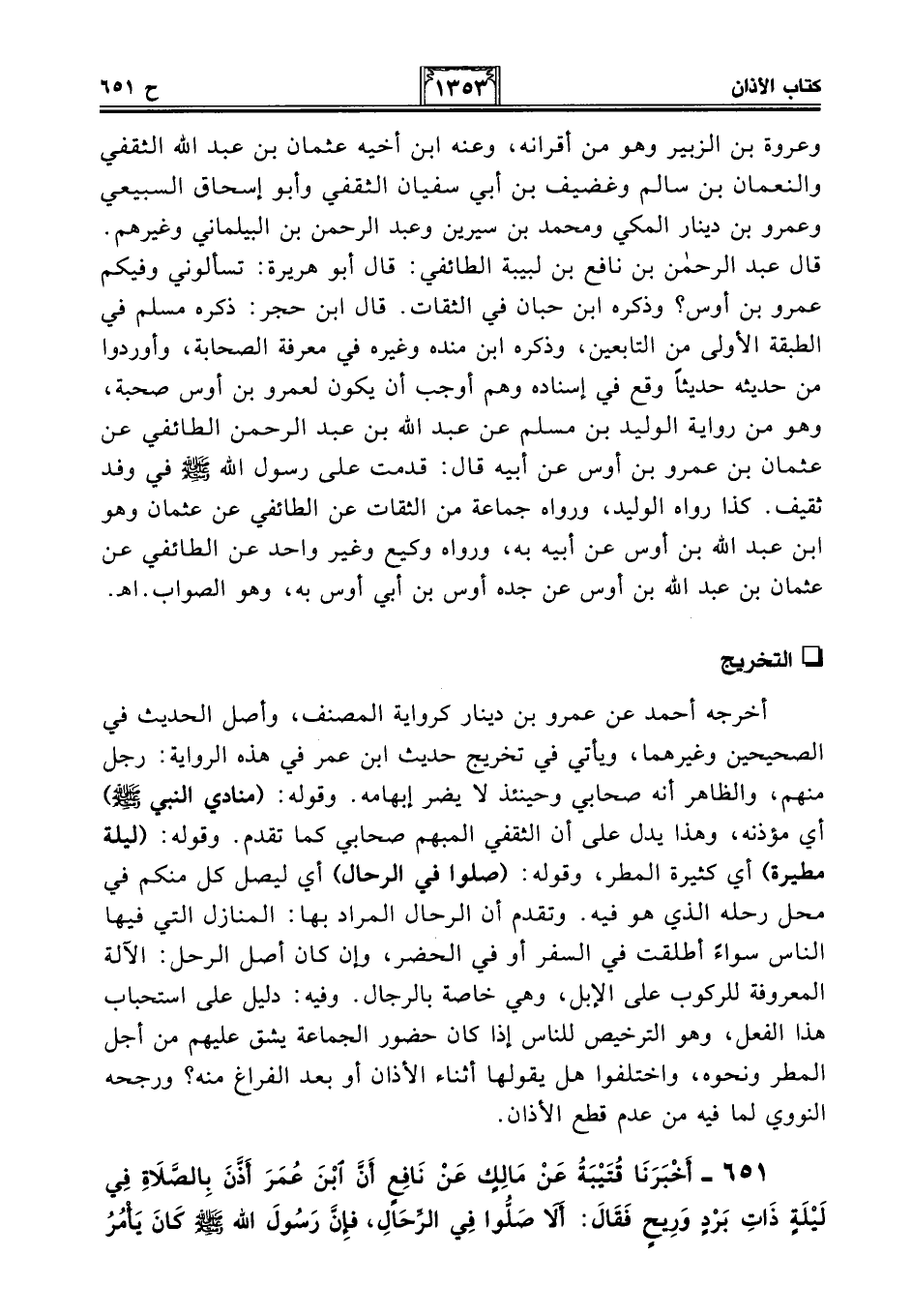 أخرجه أحمد عن عمرو بن دينار كرواية المصنف، وأصل الحديث في الصحيحين وغيرهما، ويأتي في تخريج حديث ابن عمر في هذه الرواية: رجل منهم، والظاهر أنه صحابي وحينئذ لا يضر إبهامه. وقوله: (منادي النبي - صلى الله عليه وسلم -) أي مؤذنه، وهذا يدل على أن الثقفي المبهم صحابي كما تقدم. وقوله: (ليلة مطيرة) أي كثيرة المطر، وقوله: (صلوا في الرحال) أي ليصل كل منكم في محل رحله الذي هو فيه. وتقدم أن الرحال المراد بها: المنازل التي فيها الناس سواءً أطلقت في السفر أو في الحضر، وإن كان أصل الرحل: الآلة المعروفة للركوب على الإبل، وهي خاصة بالرجال. وفيه: دليل على استحباب هذا الفعل، وهو الترخيص للناس إذا كان حضور الجماعة يشق عليهم من أجل المطر ونحوه، واختلفوا هل يقولها أثناء الأذان أو بعد الفراغ منه؟ ورجحه النووي لما فيه من عدم قطع الأذان.