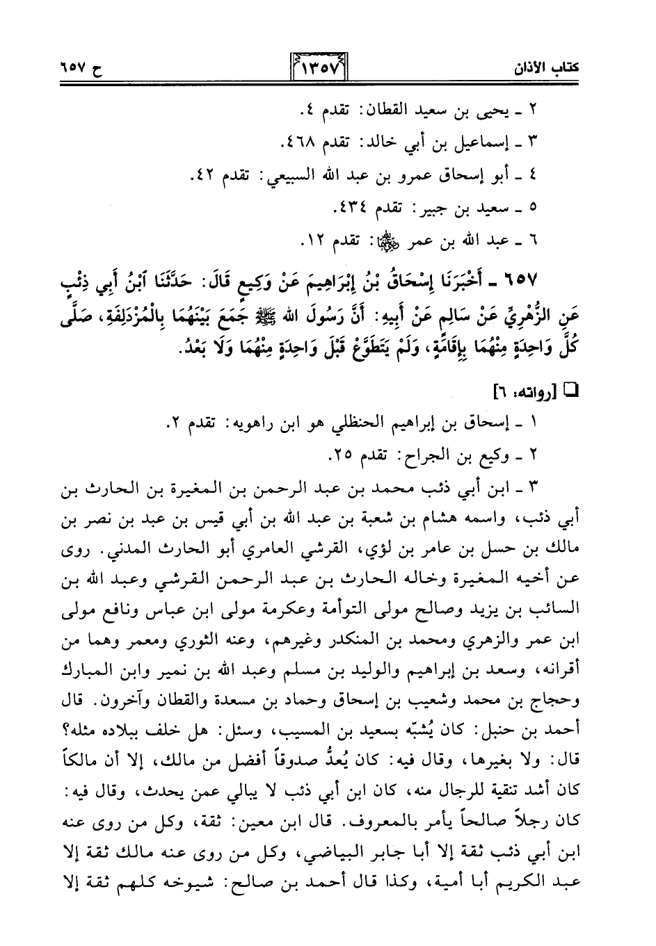 657 - أَخْبَرَنَا إِسْحَاقُ بْنُ إِبْرَاهِيمَ عَنْ وَكِيعٍ قَالَ: حَدَّثَنَا ابْنُ أَبِي ذِئْبٍ عَنِ الزُّهْرِيِّ عَنْ سَالِمٍ عَنْ أَبِيهِ: أَنَّ رَسُولَ اللَّهِ - صلى الله عليه وسلم - جَمَعَ بَيْنَهُمَا بِالْمُزْدَلِفَةِ، صَلَّى كُلَّ وَاحِدَةٍ مِنْهُمَا بِإِقَامَةٍ، وَلَمْ يَتَطَوَّعْ قَبْلَ وَاحِدَةٍ مِنْهُمَا وَلَا بَعْدُ.