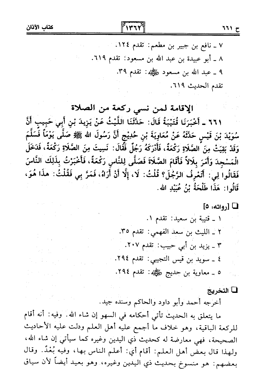 ما يتعلق به الحديث تأتي أحكامه في السهو إن شاء الله. وفيه: أنه أقام للركعة الباقية، وهو خلاف ما أجمع عليه أهل العلم ودلت عليه الأحاديث الصحيحة، فهي معارضة له كحديث ذي اليدين وغيره كما سيأتي إن شاء الله، ولهذا قال بعض أهل العلم: أقام أي: أعلم الناس بها، وفيه بُعْدٌ. وقال بعضهم: هو منسوخ بحديث ذي اليدين وغيره، وهو بعيد أيضًا لأن سياق