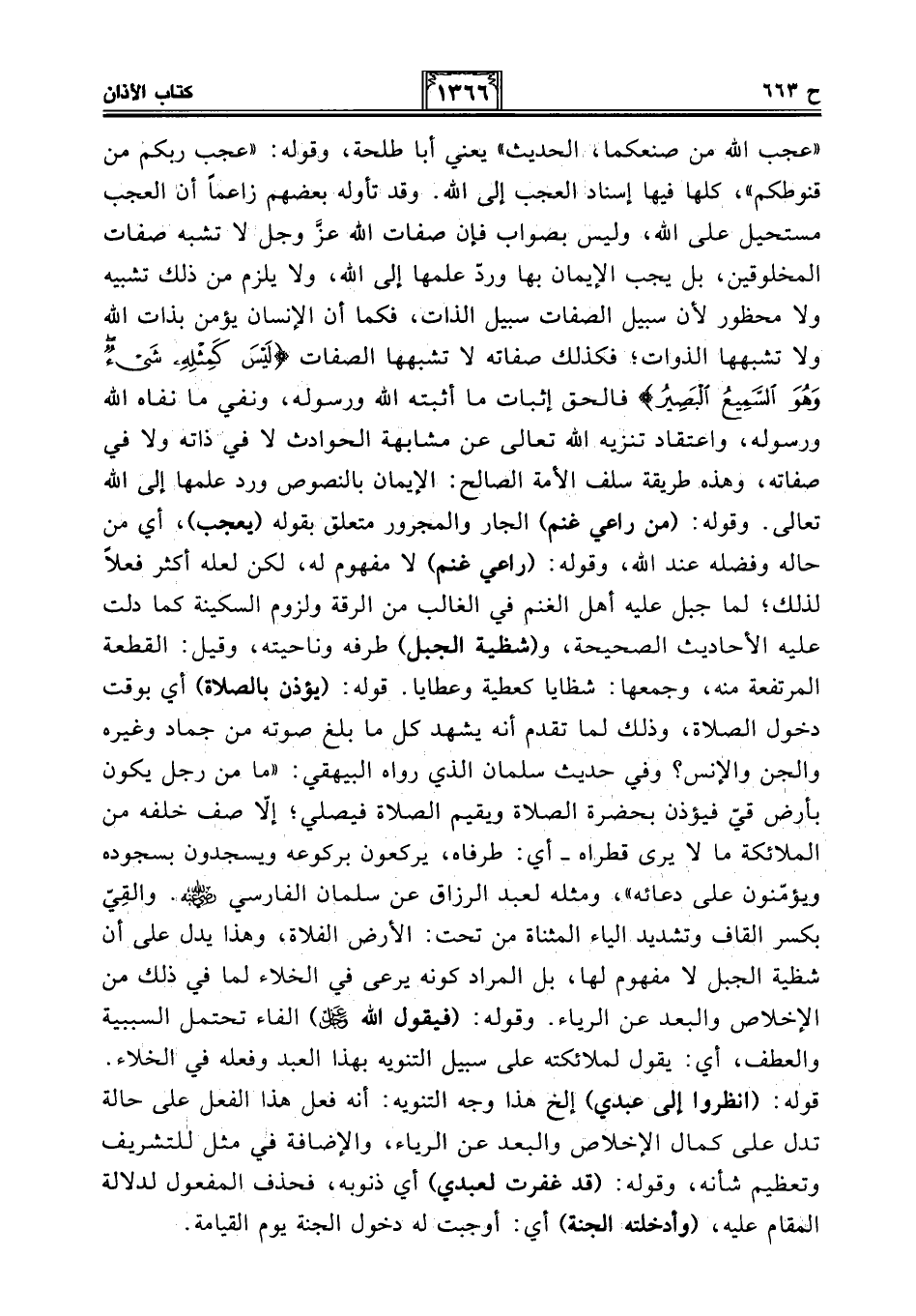 "عجب الله من صنعكما، الحديث" يعني أبا طلحة، وقوله: "عجب ربكم من قنوطكم"، كلها فيها إسناد العجب إلى الله. وقد تأوله بعضهم زاعمًا أن العجب مستحيل على الله، وليس بصواب فإن صفات الله -عَزَّ وَجَلَّ- لا تشبه صفات المخلوقين، بل يجب الإيمان بها وردّ علمها إلى الله، ولا يلزم من ذلك تشبيه ولا محظور لأن سبيل الصفات سبيل الذات، فكما أن الإنسان يؤمن بذات الله ولا تشبهها الذوات؛ فكذلك صفاته لا تشبهها الصفات {لَيْسَ كَمِثْلِهِ شَيْءٌ وَهُوَ السَّمِيعُ الْبَصِيرُ} فالحق إثبات ما أثبته الله ورسوله، ونفي ما نفاه الله ورسوله، واعتقاد تنزيه الله تعالى عن مشابهة الحوادث لا في ذاته ولا في صفاته، وهذه طريقة سلف الأمة الصالح: الإيمان بالنصوص ورد علمها إلى الله تعالى. وقوله: (من راعي غنم) الجار والمجرور متعلق بقوله (يعجب)، أي من حاله وفضله عند الله، وقوله: (راعي غنم) لا مفهوم له، لكن لعله أكثر فعلًا لذلك؛ لما جبل عليه أهل الغنم في الغالب من الرقة ولزوم السكينة كما دلت عليه الأحاديث الصحيحة، و (شظية الجبل) طرفه وناحيته، وقيل: القطعة المرتفعة منه، وجمعها: شظايا كعطية وعطايا. قوله: (يؤذن بالصلاة) أي بوقت دخول الصلاة، وذلك لما تقدم أنه يشهد كل ما بلغ صوته من جماد وغيره والجن والإنس؟ وفي حديث سلمان الذي رواه البيهقي: "ما من رجل يكون بأرض قيّ فيؤذن بحضرة الصلاة ويقيم الصلاة فيصلي؛ إلَّا صف خلفه من الملائكة ما لا يرى قطراه -أي: طرفاه، يركعون بركوعه ويسجدون بسجوده ويؤمّنون على دعائه"، ومثله لعبد الرزاق عن سلمان الفارسي - رضي الله عنه -. والقِيّ بكسر القاف وتشديد الياء المثناة من تحت: الأرض الفلاة، وهذا يدل على أن شظية الجبل لا مفهوم لها، بل المراد كونه يرعى في الخلاء لما في ذلك من الإخلاص والبعد عن الرياء. وقوله: (فيقول الله -عز وجل-) الفاء تحتمل السببية والعطف، أي: يقول لملائكته على سبيل التنويه بهذا العبد وفعله في الخلاء. قوله: (انظروا إلى عبدي) إلخ هذا وجه التنويه: أنه فعل هذا الفعل على حالة تدل على كمال الإخلاص والبعد عن الرياء، والإضافة في مثل للتشريف وتعظيم شأنه، وقوله: (قد غفرت لعبدي) أي ذنوبه، فحذف المفعول لدلالة المقام عليه، (وأدخلته الجنة) أي: أوجبت له دخول الجنة يوم القيامة.