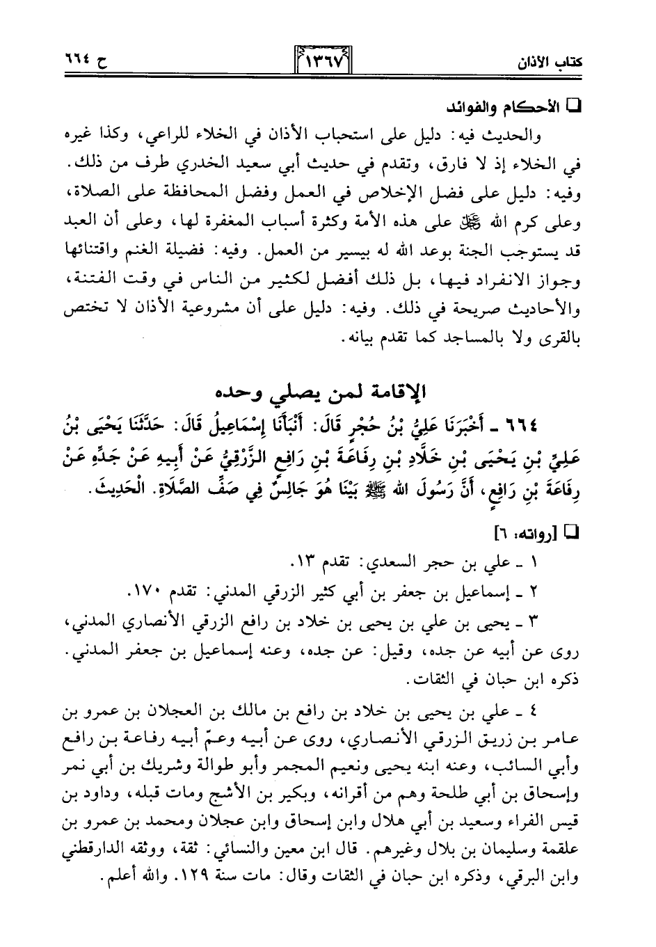 4 - علي بن يحيى بن خلاد بن رافع بن مالك بن العجلان بن عمرو بن عامر بن زريق الزرقي الأنصاري، روى عن أبيه وعم أبيه رفاعة بن رافع وأبي السائب، وعنه ابنه يحيى ونعيم المجمر وأبو طوالة وشريك بن أبي نمر وإسحاق بن أبي طلحة وهم من أقرانه، وبكير بن الأشج ومات قبله، وداود بن قيس الفراء وسعيد بن أبي هلال وابن إسحاق وابن عجلان ومحمد بن عمرو بن علقمة وسليمان بن بلال وغيرهم. قال ابن معين والنسائي: ثقة، ووثقه الدارقطني وابن البرقي، وذكره ابن حبان في الثقات وقال: مات سنة 129. والله أعلم.