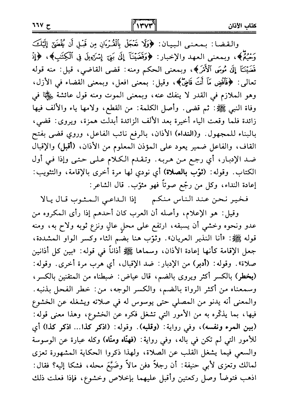 والقضا: بمعنى البيان: {وَلَا تَعْجَلْ بِالْقُرْآنِ مِنْ قَبْلِ أَنْ يُقْضَى إِلَيْكَ وَحْيُهُ}، وبمعنى العهد والإخبار: {وَقَضَيْنَا إِلَى بَنِي إِسْرَائِيلَ فِي الْكِتَابِ}، {إِذْ قَضَيْنَا إِلَى مُوسَى الْأَمْرَ}، وبمعنى الحكم ومنه: قضى القاضي، قيل: منه قوله تعالى: {فَاقْضِ مَا أَنْتَ قَاضٍ}، وقيل: بمعنى افعل، وبمعنى القضاء في الأزل، وهو الملازم في القدر لا ينفك عنه، وبمعنى الموت ومنه قول عائشة -رضي الله عنها- في وفاة النبي - صلى الله عليه وسلم -: ثم قضى. وأصل الكلمة: من القطع، ولامها ياء والألف فيها زائدة فلما وقعت الياء أخيرة بعد الألف الزائدة أبدلت همزة، ويروى: قضي، بالبناء للمجهول. و (النداء) الأذان، بالرفع نائب الفاعل، وروي قضى بفتح القاف، والفاعل ضمير يعود على المؤذن المعلوم من الأذان، (أقبل) والإقبال ضد الإدبار، أي رجع من هربه. وتقدم الكلام على حتى وإذا في أول الكتاب. وقوله: (ثوّب بالصلاة) أي نودي لها مرة أخرى بالإقامة، والتثويب: إعادة النداء، وكل من رجّع صوتًا فهو مثوّب. قال الشاعر: