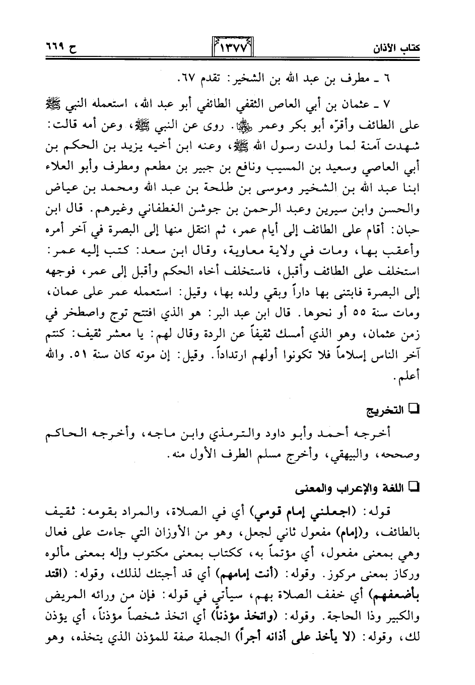 قوله: (اجعلني إمام قومي) أي في الصلاة، والمراد بقومه: ثقيف بالطائف، و (إمام) مفعول ثاني لجعل، وهو من الأوزان التي جاءت على فعال وهي بمعنى مفعول، أي مؤتمًا به، ككتاب بمعنى مكتوب وإله بمعنى مألوه وركاز بمعنى مركوز. وقوله: (أنت إمامهم) أي قد أجبتك لذلك، وقوله: (اقتد بأضعفهم) أي خفف الصلاة بهم، سيأتي في قوله: فإن من ورائه المريض والكبير وذا الحاجة. وقوله: (واتخذ مؤذنًا) أي اتخذ شخصًا مؤذنًا، أي يؤذن لك، وقوله: (لا يأخذ على أذانه أجرًا) الجملة صفة للمؤذن الذي يتخذه، وهو