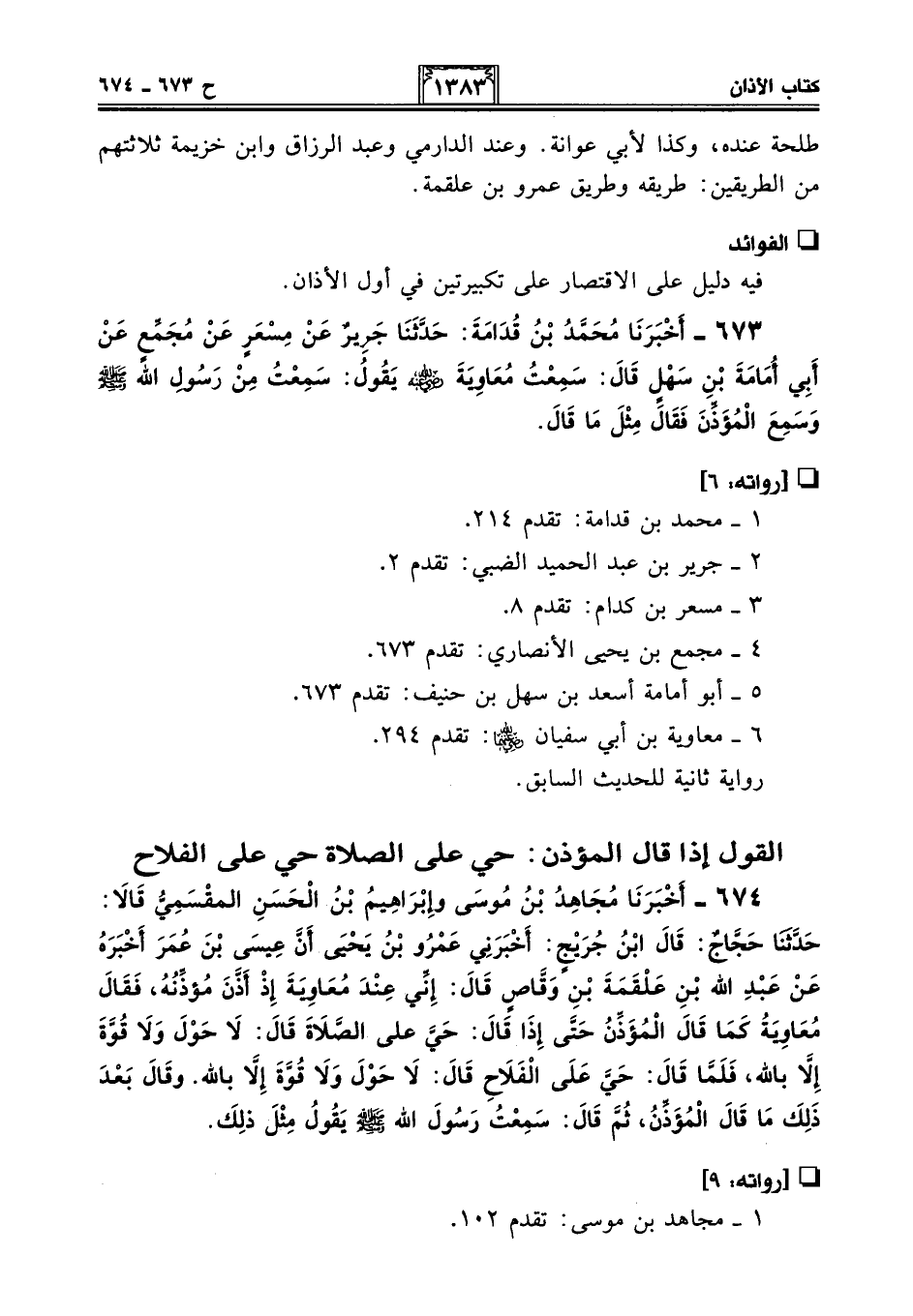 673 - أَخْبَرَنَا مُحَمَّدُ بْنُ قُدَامَةَ: حَدَّثَنَا جَرِيرٌ عَنْ مِسْعَرٍ عَنْ مُجَمِّعٍ عَنْ أَبِي أُمَامَةَ بْنِ سَهْلٍ قَالَ: سَمِعْتُ مُعَاوِيَةَ - رضى الله عنه - يَقُولُ: سَمِعْتُ مِنْ رَسُولِ اللَّهِ - صلى الله عليه وسلم - وَسَمِعَ الْمُؤَذِّنَ فَقَالَ مِثْلَ مَا قَالَ.