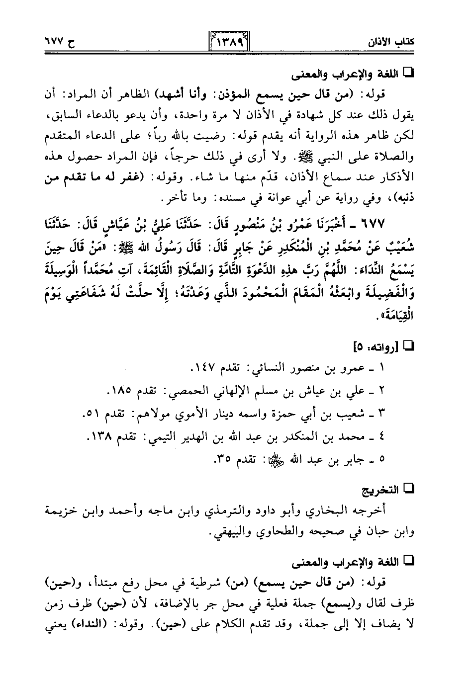 677 - أَخْبَرَنَا عَمْرُو بْنُ مَنْصُورٍ قَالَ: حَدَّثَنَا عَلِيُّ بْنُ عَيَّاشٍ قَالَ: حَدَّثَنَا شُعَيْبٌ عَنْ مُحَمَّدِ بْنِ الْمُنْكَدِرِ عَنْ جَابِرٍ قَالَ: قَالَ رَسُولُ اللَّهِ - صلى الله عليه وسلم -: "مَنْ قَالَ حِينَ يَسْمَعُ النِّدَاءَ: اللَّهُمَّ رَبَّ هَذِهِ الدَّعْوَةِ التَّامَّةِ وَالصَّلَاةِ الْقَائِمَةِ، آتِ مُحَمَّدًا الْوَسِيلَةَ وَالْفَضِيلَةَ وَابْعَثْهُ الْمَقَامَ الْمَحْمُودَ الَّذِي وَعَدْتَهُ؛ إِلَّا حَلَّتْ لَهُ شَفَاعَتِي يَوْمَ الْقِيَامَةِ".