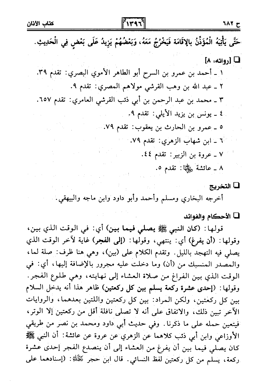 قولها: (كان النبي - صلى الله عليه وسلم - يصلي فيما بين) أي: في الوقت الذي بين، وقولها: (أن يفرغ) أي: ينتهي، وقولها: (إلى الفجر) غاية لآخر الوقت الذي يصلي فيه التهجد بالليل. وتقدم الكلام على (بين)، وهي هنا ظرف: صلة لما، والمصدر المنسبك من (أن) وما دخلت عليه مجرور بالإضافة إليها، أي: في الوقت الذي بين الفراغ من صلاة العشاء إلى نهايته، وهي طلوع الفجر. وقولها: (إحدى عشرة ركعة يسلم بين كل ركعتين) ظاهر هذا أنه يدخل السلام بين كل ركعتين، ولكن المراد: بين كل ركعتين واللتين بعدهما، والروايات الأخر تبين ذلك، والاتفاق على أنه لا تصلى نافلة أقل من ركعتين إلا الوتر، فيتعين حمله على ما ذكرنا. وفي حديث أبي داود ومحمد بن نصر من طريقي الأوزاعي وابن أبي ذئب كلاهما عن الزهري عن عروة عن عائشة: أن النبي - صلى الله عليه وسلم - كان يصلي فيما بين أن يفرغ من العشاء إلى أن ينصدع الفجر إحدى عشرة ركعة، يسلم من كل ركعتين لفظ النسائي. قال ابن حجر -رحمه الله-: (إسنادهما على