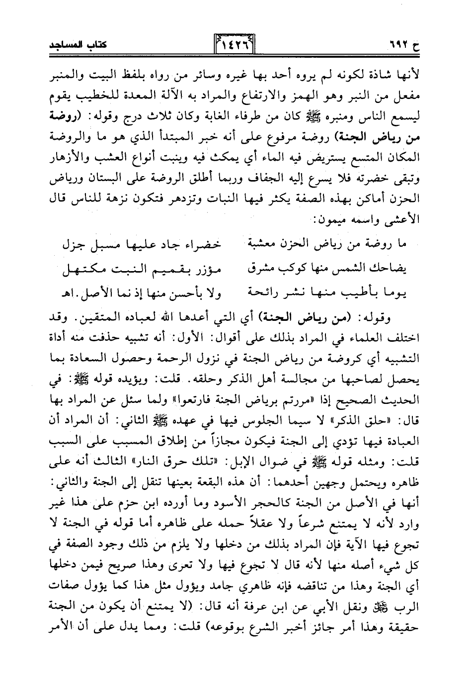 وقوله: (من رياض الجنة) أي التي أعدها الله لعباده المتقين. وقد اختلف العلماء في المراد بذلك على أقوال: الأول: أنه تشبيه حذفت منه أداة التشبيه أي كروضة من رياض الجنة في نزول الرحمة وحصول السعادة بما يحصل لصاحبها من مجالسة أهل الذكر وحلقه. قلت: ويؤيده قوله - صلى الله عليه وسلم -: في الحديث الصحيح إذا "مررتم برياض الجنة فارتعوا" ولما سئل عن المراد بها قال: "حلق الذكر" لاسيما الجلوس فيها في عهده - صلى الله عليه وسلم - الثاني: أن المراد أن العبادة فيها تؤدي إلى الجنة فيكون مجازًا من إطلاق المسبب على السبب قلت: ومثله قوله - صلى الله عليه وسلم - في ضوال الإبل: "تلك حرق النار" الثالث أنه على ظاهره ويحتمل وجهين أحدهما: أن هذه البقعة بعينها تنقل إلى الجنة والثاني: أنها في الأصل من الجنة كالحجر الأسود وما أورده ابن حزم على هذا غير وارد لأنه لا يمتنع شرعًا ولا عقلا حمله على ظاهره أما قوله في الجنة لا تجوع فيها الآية فإن المراد بذلك من دخلها ولا يلزم من ذلك وجود الصفة في كل شيء أصله منها لأنه قال لا تجوع فيها ولا تعرى وهذا صريح فيمن دخلها أي الجنة وهذا من تناقضه فإنه ظاهري جامد ويؤول مثل هذا كما يؤول صفات الرب -عز وجل- ونقل الأبي عن ابن عرفة أنه قال: (لا يمتنع أن يكون من الجنة حقيقة وهذا أمر جائز أخبر الشرع بوقوعه) قلت: ومما يدل على أن الأمر
