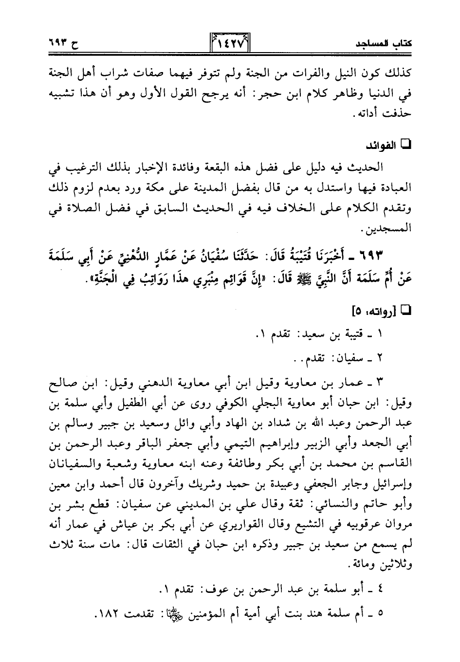 693 - أَخْبَرَنَا قُتَيْبَةُ قَالَ: حَدَّثَنَا سُفْيَانُ عَنْ عَمَّارٍ الدُّهْنِيِّ عَنْ أَبِي سَلَمَةَ عَنْ أُمِّ سَلَمَةَ أَنَّ النَّبِيَّ - صلى الله عليه وسلم - قَالَ: "إِنَّ قَوَائِمَ مِنْبَرِي هَذَا رَوَاتِبُ فِي الْجَنَّةِ".