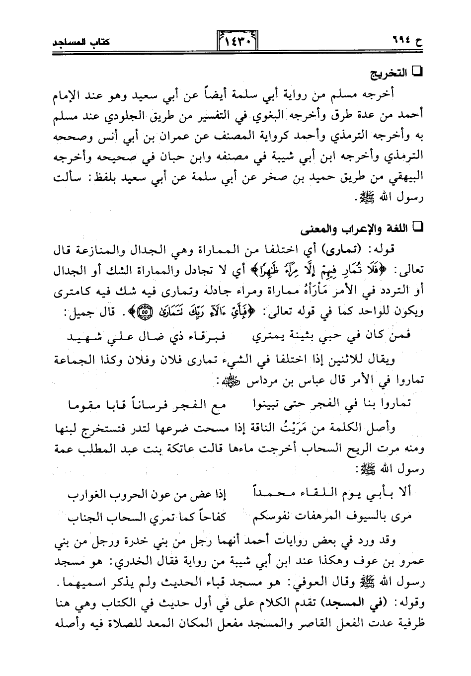 وقد ورد في بعض روايات أحمد أنهما رجل من بني خدرة ورجل من بني عمرو بن عوف وهكذا عند ابن أبي شيبة من رواية فقال الخدري: هو مسجد رسول الله - صلى الله عليه وسلم - وقال العوفي: هو مسجد قباء الحديث ولم يذكر اسميهما. وقوله: (في المسجد) تقدم الكلام على «في» في أول حديث في الكتاب وهي هنا ظرفية عدت الفعل القاصر والمسجد مفعل المكان المعد للصلاة فيه وأصله