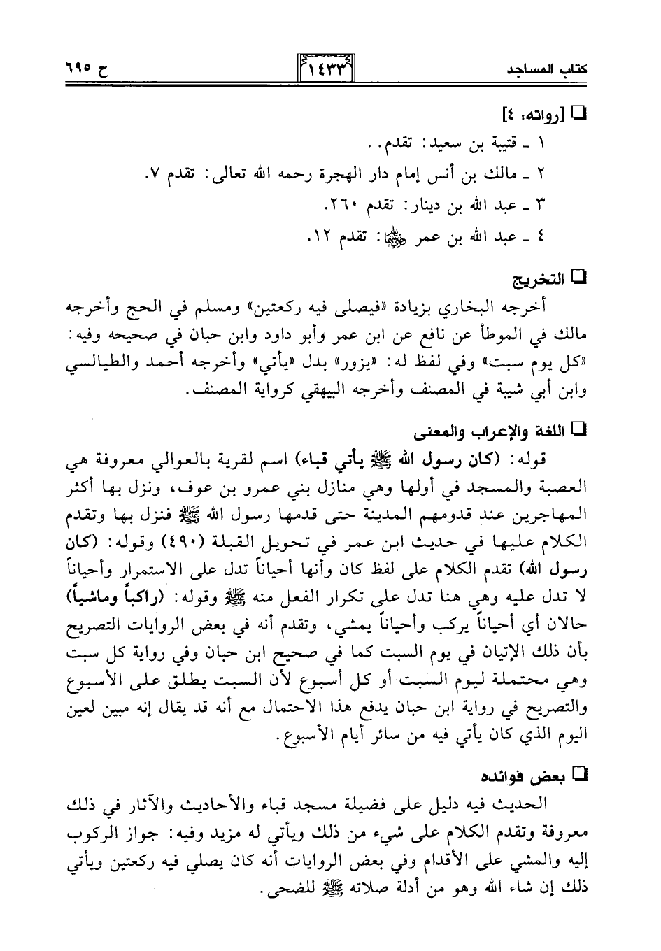 قوله: (كان رسول الله - صلى الله عليه وسلم - يأتي قباء) اسم لقرية بالعوالي معروفة هي العصبة والمسجد في أولها وهي منازل بني عمرو بن عوف، ونزل بها أكثر المهاجرين عند قدومهم المدينة حتى قدمها رسول الله - صلى الله عليه وسلم - فنزل بها وتقدم الكلام عليها في حديث ابن عمر في تحويل القبلة (490) وقوله: (كان رسول الله) تقدم الكلام على لفظ كان وأنها أحيانًا تدل على الاستمرار وأحيانًا لا تدل عليه وهي هنا تدل على تكرار الفعل منه - صلى الله عليه وسلم - وقوله: (راكبًا وماشيًا) حالان أي أحيانًا يركب وأحيانا يمشي، وتقدم أنه في بعض الروايات التصريح بأن ذلك الإتيان في يوم السبت كما في صحيح ابن حبان وفي رواية كل سبت وهي محتملة ليوم السبت أو كل أسبوع لأن السبت يطلق على الأسبوع والتصريح في رواية ابن حبان يدفع هذا الاحتمال مع أنه قد يقال إنه مبين لعين اليوم الذي كان يأتي فيه من سائر أيام الأسبوع.