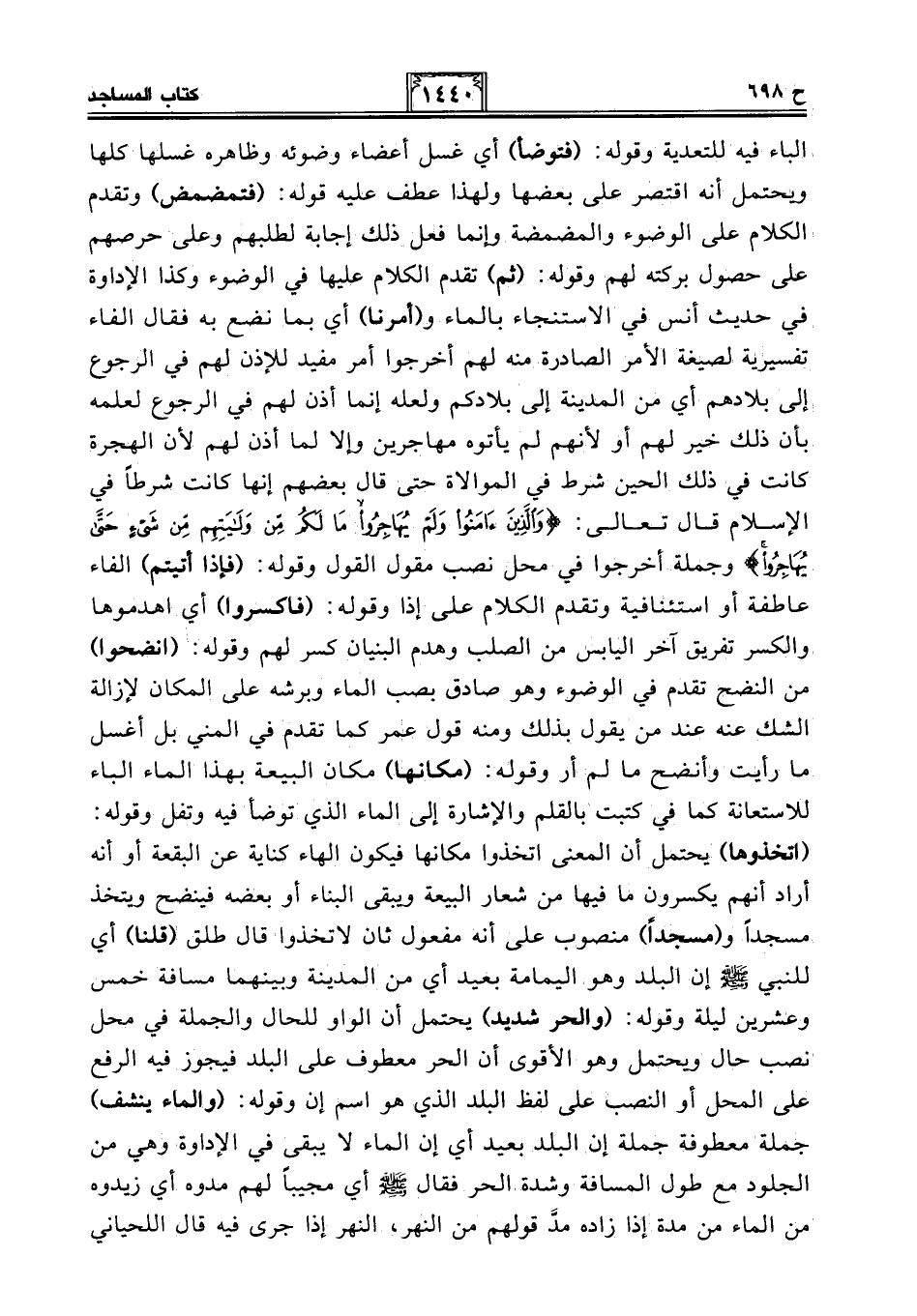 الباء فيه للتعدية وقوله: (فتوضأ) أي غسل أعضاء وضوئه وظاهره غسلها كلها ويحتمل أنه اقتصر على بعضها ولهذا عطف عليه قوله: (فتمضمض) وتقدم الكلام على الوضوء والمضمضة وإنما فعل ذلك إجابة لطلبهم وعلى حرصهم على حصول بركته لهم وقوله: (ثم) تقدم الكلام عليها في الوضوء وكذا الإداوة في حديث أنس في الاستنجاء بالماء و (أمرنا) أي بما نضع به فقال الفاء تفسيرية لصيغة الأمر الصادرة منه لهم أخرجوا أمر مفيد للإذن لهم في الرجوع إلى بلادهم أي من المدينة إلى بلادكم ولعله إنما أذن لهم في الرجوع لعلمه بأن ذلك خير لهم أو لأنهم لم يأتوه مهاجرين وإلا لما أذن لهم لأن الهجرة كانت في ذلك الحين شرط في الموالاة حتى قال بعضهم إنها كانت شرطًا في الإِسلام قال تعالى: {وَالَّذِينَ آمَنُوا وَلَمْ يُهَاجِرُوا مَا لَكُمْ مِنْ وَلَايَتِهِمْ مِنْ شَيْءٍ حَتَّى يُهَاجِرُوا} وجملة أخرجوا في محل نصب مقول القول وقوله: (فإذا أتيتم) الفاء عاطفة أو استئنافية وتقدم الكلام على إذا وقوله: (فاكسروا) أي اهدموها والكسر تفريق آخر اليابس من الصلب وهدم البنيان كسر لهم وقوله: (انضحوا) من النضح تقدم في الوضوء وهو صادق بصب الماء وبرشه على المكان لإزالة الشك عنه عند من يقول بذلك ومنه قول عمر كما تقدم في المني بل أغسل ما رأيت وأنضح ما لم أر وقوله: (مكانها) مكان البيعة بهذا الماء الباء للاستعانة كما في كتبت بالقلم والإشارة إلى الماء الذي توضأ فيه وتفل وقوله: (اتخذوها) يحتمل أن المعنى اتخذوا مكانها فيكون الهاء كناية عن البقعة أو أنه أراد أنهم يكسرون ما فيها من شعار البيعة ويبقى البناء أو بعضه فينضح ويتخذ مسجدًا و (مسجدًا) منصوب على أنه مفعول ثان لاتخذوا قال طلق (قلنا) أي للنبي - صلى الله عليه وسلم - إن البلد وهو اليمامة بعيد أي من المدينة وبينهما مسافة خمس وعشرين ليلة وقوله: (والحر شديد) يحتمل أن الواو للحال والجملة في محل نصب حال ويحتمل وهو الأقوى أن الحر معطوف على البلد فيجوز فيه الرفع على المحل أو النصب على لفظ البلد الذي هو اسم إن وقوله: (والماء ينشف) جملة معطوفة جملة إن البلد بعيد أي إن الماء لا يبقى في الإداوة وهي من الجلود مع طول المسافة وشدة الحر فقال - صلى الله عليه وسلم - أي مجيبًا لهم مدوه أي زيدوه من الماء من مدة إذا زاده مدَّ قولهم من النهر، النهر إذا جرى فيه قال اللحياني