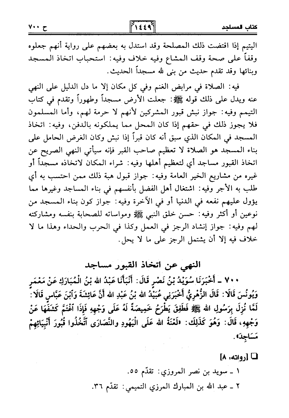 فيه: الصلاة في مرابض الغنم وفي كل مكان إلا ما دل الدليل على النهي عنه ويدل على ذلك قوله - صلى الله عليه وسلم -: جعلت الأرض مسجدًا وطهورًا وتقدم في كتاب التيمم وفيه: جواز نبش قبور المشركين لأنهم لا حرمة لهم، وأما المسلمون فلا يجوز ذلك في حقهم إذا كان المحل مما يملكونه بالدفن، وفيه: اتخاذ المسجد في المكان الذي سبق أنه كان قبرًا إذا نبش وكان الغرض الحامل على بناء المسجد هو الصلاة لا تعظيم صاحب القبر فإنه سيأتي النهي الصريح عن اتخاذ القبور مساجد أي لتعظيم أهلها وفيه: شراء المكان لاتخاذه مسجدًا أو غيره من مشاريع الخير العامة وفيه: جواز قبول هبة ذلك ممن احتسب به أي طلب به الأجر وفيه: اشتغال أهل الفضل بأنفسهم في بناء المساجد وغيرها مما يؤول عليهم نفعه في الدنيا أو في الآخرة وفيه: جواز كون بناء المسجد من نوعين أو أكثر وفيه: حسن خلق النبي - صلى الله عليه وسلم - ومواساته للصحابة بنفسه ومشاركته لهم وفيه: جواز إنشاد الرجز في العمل وكذا في الحرب والحداء وهذا ما لا خلاف فيه إلا أن يشتمل الرجز على ما لا يحل.