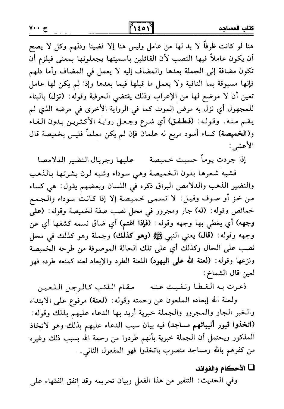 ولعنة الله إبعاده الملعون عن رحمته وقوله: (لعنة) مرفوع على الابتداء والخبر الجار والمجرور والجملة خبرية أريد بها الدعاء عليهم بذلك وقوله: (اتخذوا قبور أنبيائهم مساجد) فيه بيان سبب الدعاء عليهم بذلك وهو لاتخاذ المذكور ويحتمل أن الجملة خبرية بأنهم طردوا من رحمة الله بسبب ذلك وغيره من كفرهم بالله ومساجد منصوب باتخذوا فهو المفعول الثاني.