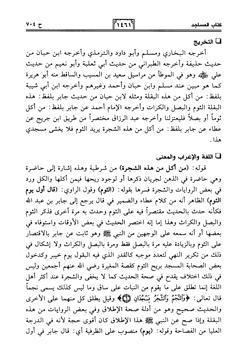أخرجه البخاري ومسلم وأبو داود والترمذي وأخرجه ابن حبان من حديث حذيفة وأخرجه الطبراني من حديث أبي ثعلبة وأبو نعيم من حديث علي - رضي الله عنه - وهو في الموطأ من مراسيل سعيد بن المسيب والساقط منه أبو هريرة كما هو مبين عند مسلم وابن حبان وأحمد وغيرهم وأخرجه ابن أبي شيبة بلفظ: من أكل من هذه البقلة ومثله لابن حبان من حديث جابر بلفظ: هذه البقلة الثوم والبصل والكرات وأخرجه الإِمام أحمد عن جابر بلفظ: من أكل ثومًا أو بصلًا فليعتزلنا وأخرجه عبد الرزاق مختصرًا من طريق ابن جريج عن عطاء عن جابر بلفظ: من أكل من هذه الشجرة يريد الثوم فلا يغشى مسجدي هذا.