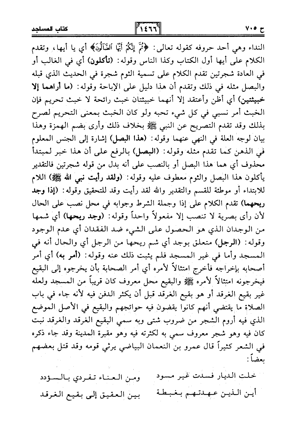 النداء وهي أحد حروفه كقوله تعالى: {ثُمَّ إِنَّكُمْ أَيُّهَا الضَّالُّونَ} أي يا أيها، وتقدم الكلام على أيها أول الكتاب وكذا الناس وقوله: (تأكلون) أي في الغالب أو في العادة شجرتين تقدم الكلام على تسمية الثوم شجرة في الحديث الذي قبله والبصل مثله في ذلك وتقدم أن هذا دليل على الإباحة وقوله: (ما أراهما إلا خبيثتين) أي أظن وأعتقد إلا أنهما خبيثتان خبث رائحة لا خبث تحريم فإن الخبث أمر نسبي في كل شيء تحبه ولو كان الخبث بمعنى التحريم لصرح بذلك وقد تقدم التصريح عن النبي - صلى الله عليه وسلم - بخلاف ذلك وأرى بضم الهمزة وهذا بيان لوجه العلة في النهي عنهما وقوله: (هذا البصل) إشارة إلى الجنس المعلوم في الذهن كما تقدم مثله وقوله: (البصل) بالرفع على أن هذا خبر لمبتدأ محذوف أي هما هذا البصل أو بالنصب على أنه بدل من قوله شجرتين فالتقدير يأكلون هذا البصل والثوم معطوف عليه وقوله: (ولقد رأيت نبي الله - صلى الله عليه وسلم -) اللام للابتداء أو موطئة للقسم والتقدير والله لقد رأيت وقد للتحقيق وقوله: (إذا وجد ريحهما) تقدم الكلام على إذا وجملة الشرط وجوابه في محل نصب على الحال لأن رأى بصرية لا تنصب إلا مفعولًا واحدًا وقوله: (وجد ريحها) أي شمها من الوجدان الذي هو الحصول على الشيء ضد الفقدان أي عدم الوجود وقوله: (الرجل) متعلق بوجد أي شم ريحها من الرجل أي والحال أنه في المسجد وأما في غير المسجد فلم يثبت ذلك عنه وقوله: (أمر به) أي أمر أصحابه بإخراجه فأخرج امتثالًا لأمره أي أمر الصحابة بأن يخرجوه إلى البقيع فيخرجونه امتثالًا لأمره - صلى الله عليه وسلم - والبقيع محل معروف كان قريبًا من المسجد ولعله غير بقيع الغرقد أو هو بقيع الغرقد قبل أن يكثر الدفن فيه لأنه جاء في باب الصلاة ما يقتضي أنهم كانوا يقضون فيه حوائجهم والبقيع في الأصل الموضع الذي فيه أروم الشجر من ضروب شتى وبه سمي البقيع الغرقد والغرقد نبت كان فيه وهو شجر معروف سمي به لكثرته فيه وهو مقبرة المدينة وقد جاء ذكره في الشعر كثيرًا قال عمرو بن النعمان البياضي يرثي قومه وقد قتل بعضهم بعضًا: