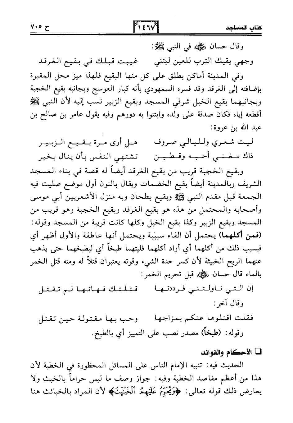 وبقيع الخجبة قريب من بقيع الغرقد أيضًا له قصة في بناء المسجد الشريف وبالمدينة أيضًا بقيع الخضمات ويقال بالنون أول موضع صليت فيه الجمعة قبل مقدم النبي - صلى الله عليه وسلم - وبقيع بطحان وبه منزل الأشعريين أبي موسى وأصحابه والمحتمل من هذه هو بقيع الغرقد وبقيع الخجبة وهو قريب من المسجد وبقيع الزبير وكذا بقيع الخيل وكلها كانت قريبة من المسجد وقوله: (فمن أكلهما) يحتمل أن الفاء سببية ويحتمل أنها عاطفة والأول أظهر أي فبسبب ذلك من أكلهما أي أراد أكلهما فليمتهما طبخًا أي ليطبخهما حتى يذهب عنهما الريح الخبيثة لأن كسر حدة الشيء وقوته يعتبران قتلًا له ومنه قتل الخمر بالماء قال حسان - رضي الله عنه - قبل تحريم الخمر: