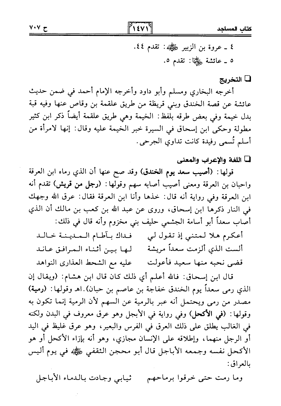 قال ابن إسحاق: فالله أعلم أي ذلك كان قال ابن هشام: (ويقال إن الذي رمى سعدًا يوم الخندق خفاجة بن عاصم بن حبان). اهـ وقولها: (رمية) مصدر من رمى ويحتمل أنه عبر بالرمية عن السهم لأن الرمية إنما تكون به وقولها: (في الأكحل) وفي رواية في الأبجل وهو عرق معروف في البدن ولكنه في الغالب يطلق على ذلك العرق في الفرس والبعير، وهو عرق غليظ في اليد أو الرجل منهما، وإطلاقه على الإنسان مجازي، وهو أنه بإزاء الأكحل أو هو الأكحل نفسه وجمعه الأباجل قال أبو محجن الثقفي - رضي الله عنه - في يوم أليس بالعراق: