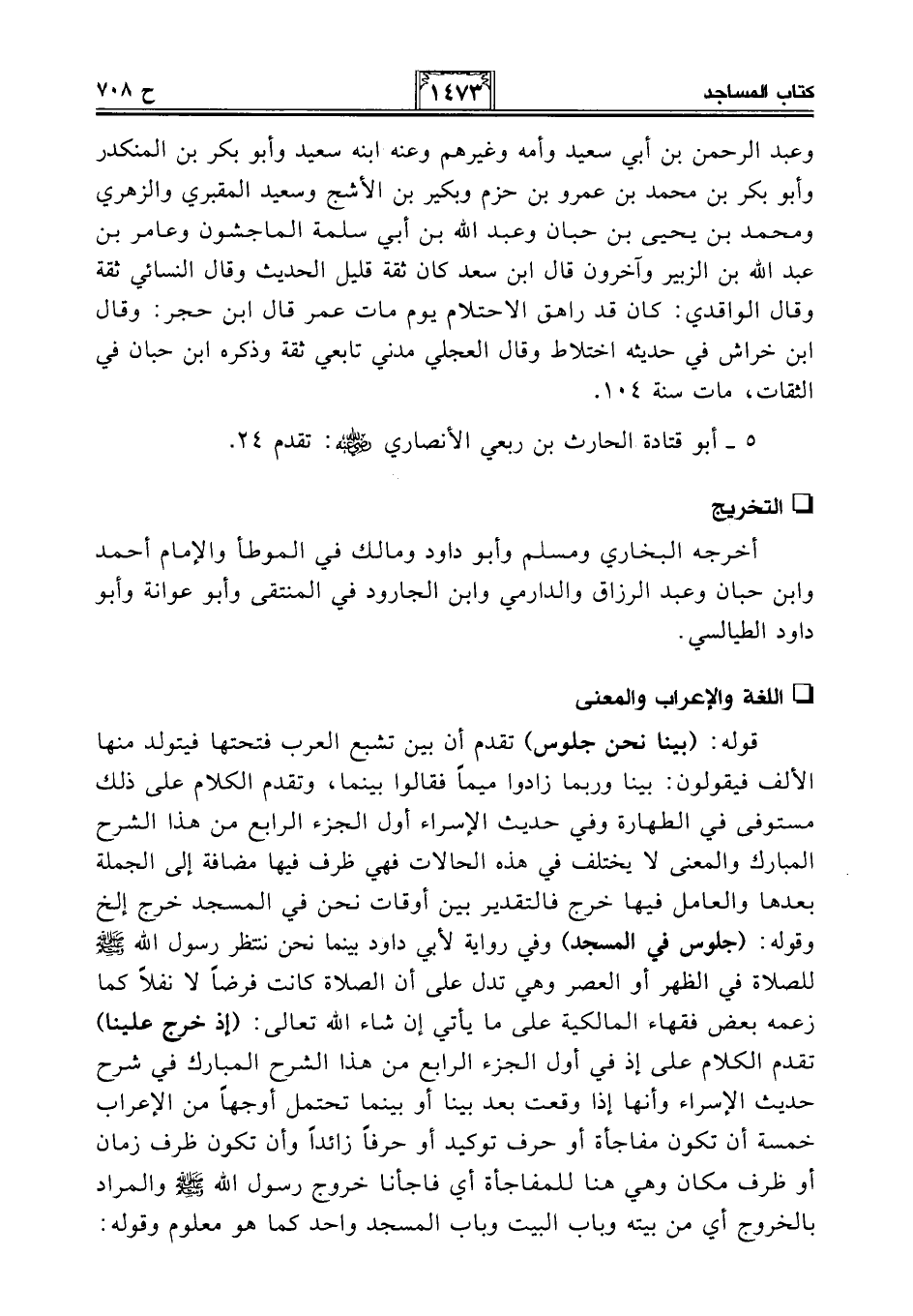 قوله: (بينا نحن جلوس) تقدم أن بين تشبع العرب فتحتها فيتولد منها الألف فيقولون: بينا وربما زادوا ميمًا فقالوا بينما، وتقدم الكلام على ذلك مستوفى في الطهارة وفي حديث الإسراء أول الجزء الرابع من هذا الشرح المبارك والمعنى لا يختلف في هذه الحالات فهي ظرف فيها مضافة إلى الجملة بعدها والعامل فيها خرج فالتقدير بين أوقات نحن في المسجد خرج إلخ وقوله: (جلوس في المسجد) وفي رواية لأبي داود بينما نحن ننتظر رسول الله - صلى الله عليه وسلم - للصلاة في الظهر أو العصر وهي تدل على أن الصلاة كانت فرضًا لا نفلًا كما زعمه بعض فقهاء المالكية على ما يأتي إن شاء الله تعالى: (إذ خرج علينا) تقدم الكلام على إذ في أول الجزء الرابع من هذا الشرح المبارك في شرح حديث الإسراء وأنها إذا وقعت بعد بينا أو بينما تحتمل أوجهًا من الإعراب خمسة أن تكون مفاجأة أو حرف توكيد أو حرفًا زائدًا وأن تكون ظرف زمان أو ظرف مكان وهي هنا للمفاجأة أي فاجأنا خروج رسول الله - صلى الله عليه وسلم - والمراد بالخروج أي من بيته وباب البيت وباب المسجد واحد كما هو معلوم وقوله: