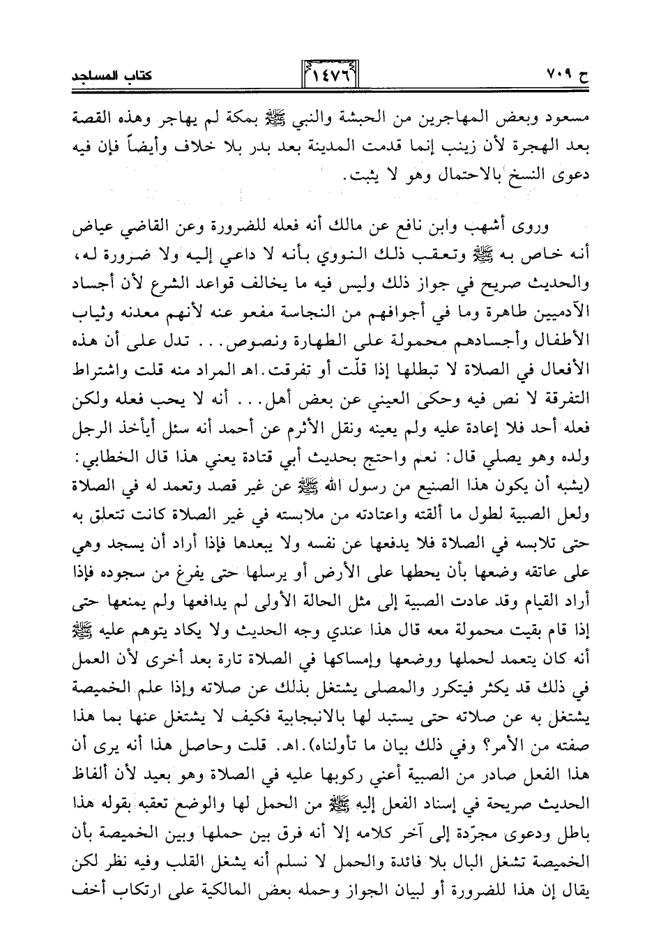 وروى أشهب وابن نافع عن مالك أنه فعله للضرورة وعن القاضي عياض أنه خاص به - صلى الله عليه وسلم - وتعقب ذلك النووي بأنه لا داعي إليه ولا ضرورة له، والحديث صريح في جواز ذلك وليس فيه ما يخالف قواعد الشرع لأن أجساد الآدميين طاهرة وما في أجوافهم من النجاسة مفعو عنه لأنهم معدنه وثياب الأطفال وأجسادهم محمولة على الطهارة ونصوص. . . تدل على أن هذه الأفعال في الصلاة لا تبطلها إذا قلّت أو تفرقت. اهـ المراد منه قلت واشتراط التفرقة لا نص فيه وحكى العيني عن بعض أهل. . . أنه لا يحب فعله ولكن فعله أحد فلا إعادة عليه ولم يعينه ونقل الأثرم عن أحمد أنه سئل أيأخذ الرجل ولده وهو يصلي قال: نعم واحتج بحديث أبي قتادة يعني هذا قال الخطابي: (يشبه أن يكون هذا الصنيع من رسول الله - صلى الله عليه وسلم - عن غير قصد وتعمد له في الصلاة ولعل الصبية لطول ما ألقته واعتادته من ملابسته في غير الصلاة كانت تتعلق به حتى تلابسه في الصلاة فلا يدفعها عن نفسه ولا يبعدها فإذا أراد أن يسجد وهي على عاتقه وضعها بأن يحطها على الأرض أو يرسلها حتى يفرغ من سجوده فإذا أراد القيام وقد عادت الصبية إلى مثل الحالة الأولى لم يدافعها ولم يمنعها حتى إذا قام بقيت محمولة معه قال هذا عندي وجه الحديث ولا يكاد يتوهم عليه - صلى الله عليه وسلم - أنه كان يتعمد لحملها ووضعها وإمساكها في الصلاة تارة بعد أخرى لأن العمل في ذلك قد يكثر فيتكرر والمصلى يشتغل بذلك عن صلاته وإذا علم الخميصة يشتغل به عن صلاته حتى يستبد لها بالانبجابية فكيف لا يشتغل عنها بما هذا صفته من الأمر؟ وفي ذلك بيان ما تأولناه). اهـ. قلت وحاصل هذا أنه يرى أن هذا الفعل صادر من الصبية أعني ركوبها عليه في الصلاة وهو بعيد لأن ألفاظ الحديث صريحة في إسناد الفعل إليه - صلى الله عليه وسلم - من الحمل لها والوضع تعقبه بقوله هذا باطل ودعوى مجرّدة إلى آخر كلامه إلا أنه فرق بين حملها وبين الخميصة بأن الخميصة تشغل البال بلا فائدة والحمل لا نسلم أنه يشغل القلب وفيه نظر لكن يقال إن هذا للضرورة أو لبيان الجواز وحمله بعض المالكية على ارتكاب أخف
