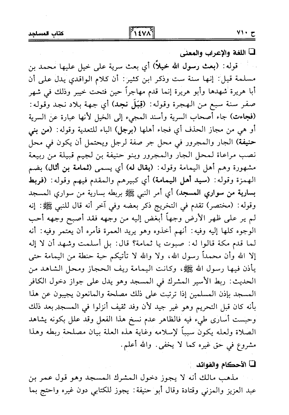 قوله: (بعث رسول الله خيلًا) أي بعث سرية على خيل عليها محمد بن مسلمة قيل: إنها سنة ست وذكر ابن كثير: أن كلام الواقدي يدل على أن أبا هريرة شهدها وأبو هريرة إنما قدم مهاجرًا حين فتحت خيبر وذلك في شهر صفر سنة سبع من الهجرة وقوله: (قِبَلَ نجد) أي جهة بلاد نجد وقوله: (فجاءت) جاء أصحاب السرية وأسند المجيء إلى الخيل لأنها عبارة عن السرية أو هي من مجاز الحذف أي فجاء أهلها (برجل) الباء للتعدية وقوله: (من بني حنيفة) الجار والمجرور في محل جر صفة لرجل ويحتمل أن يكون في محل نصب مراعاة لمحل الجار والمجرور وبنو حنيفة بن لجيم قبيلة من ربيعة مشهورة وهم أهل اليمامة وقوله: (يقال له) أي يسمى (ثمامة بن أثال) بضم الهمزة وقوله: (سيد أهل اليمامة) أي كبيرهم والمقدم فيهم وقوله: (فربط بسارية من سواري المسجد) أي أمر النبي - صلى الله عليه وسلم - بربطه بسارية من سواري المسجد وقوله: (مختصر) تقدم في التخريج ذكر بعضه وفي آخر أنه قال للنبي - صلى الله عليه وسلم -: إنه لم ير على ظهر الأرض وجهًا أبغض إليه من وجهه فقد أصبح وجهه أحب الوجوه كلها إليه وفيه: أنهم أخذوه وهو يريد العمرة فأمره أن يعتمر وفيه: أنه لما قدم مكة قالوا له: صبوت يا ثمامة؟ قال: بل أسلمت وشهد أن لا إله إلا الله وأن محمدًا رسول الله، ولا والله لا تأتيكم حبَّة حنطة من اليمامة حتى يأذن فيها رسول الله - صلى الله عليه وسلم -، وكانت اليمامة ريف الحجاز ومحل الشاهد من الحديث: ربط الأسير المشرك في المسجد وهو يدل على جواز دخول الكافر المسجد بإذن المسلمين إذا ترتبت على ذلك مصلحة والمانعون يجيبون عن هذا بأنه كان قبل التحريم وهو غير جيد لأن وفد ثقيف أنزلوا في المسجد بعد ذلك وحبست أسارى طيء فيه فالظاهر عدم نسخ هذا الفعل وقد علل بكونه يشاهد الصلاة ولعله يكون سببًا لإسلامه وغاية هذه العلة بيان مصلحة ربطه وهذا مشروع في حق غيره كما لا يخفى. والله أعلم.
