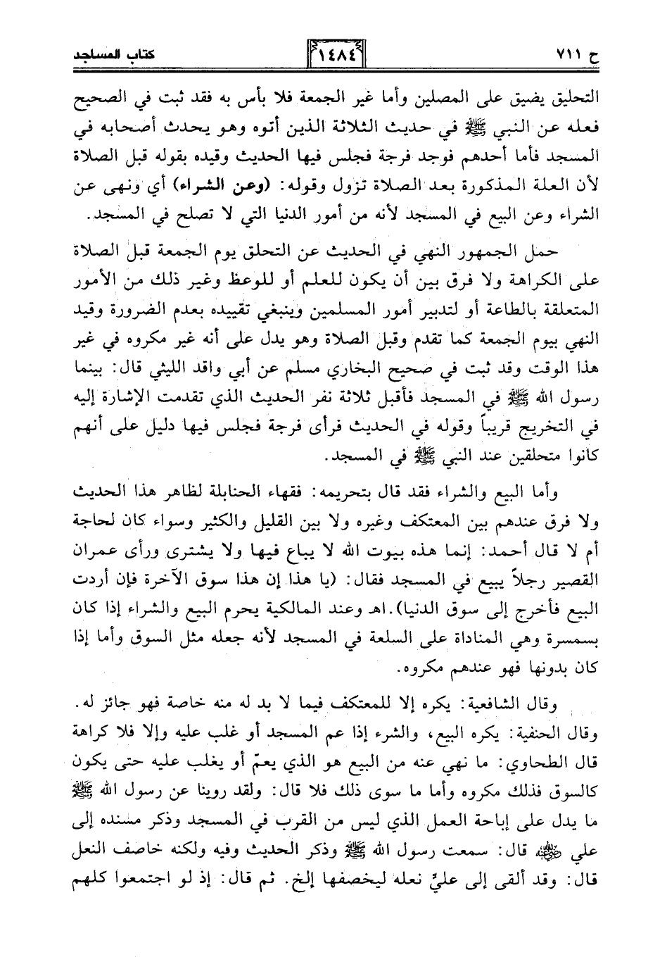 وقال الشافعية: يكره إلا للمعتكف فيما لابد له منه خاصة فهو جائز له. وقال الحنفية: يكره البيع، والشراء إذا عم المسجد أو غلب عليه وإلا فلا كراهة قال الطحاوي: ما نهي عنه من البيع هو الذي يعمّ أو يغلب عليه حتى يكون كالسوق فذلك مكروه وأما ما سوى ذلك فلا قال: ولقد روينا عن رسول الله - صلى الله عليه وسلم - ما يدل على إباحة العمل الذي ليس من القرب في المسجد وذكر مسنده إلى علي - رضي الله عنه - قال: سمعت رسول الله - صلى الله عليه وسلم - وذكر الحديث وفيه ولكنه خاصف النعل قال: وقد ألقى إلى عليِّ نعله ليخصفها إلخ. ثم قال: إذ لو اجتمعوا كلهم