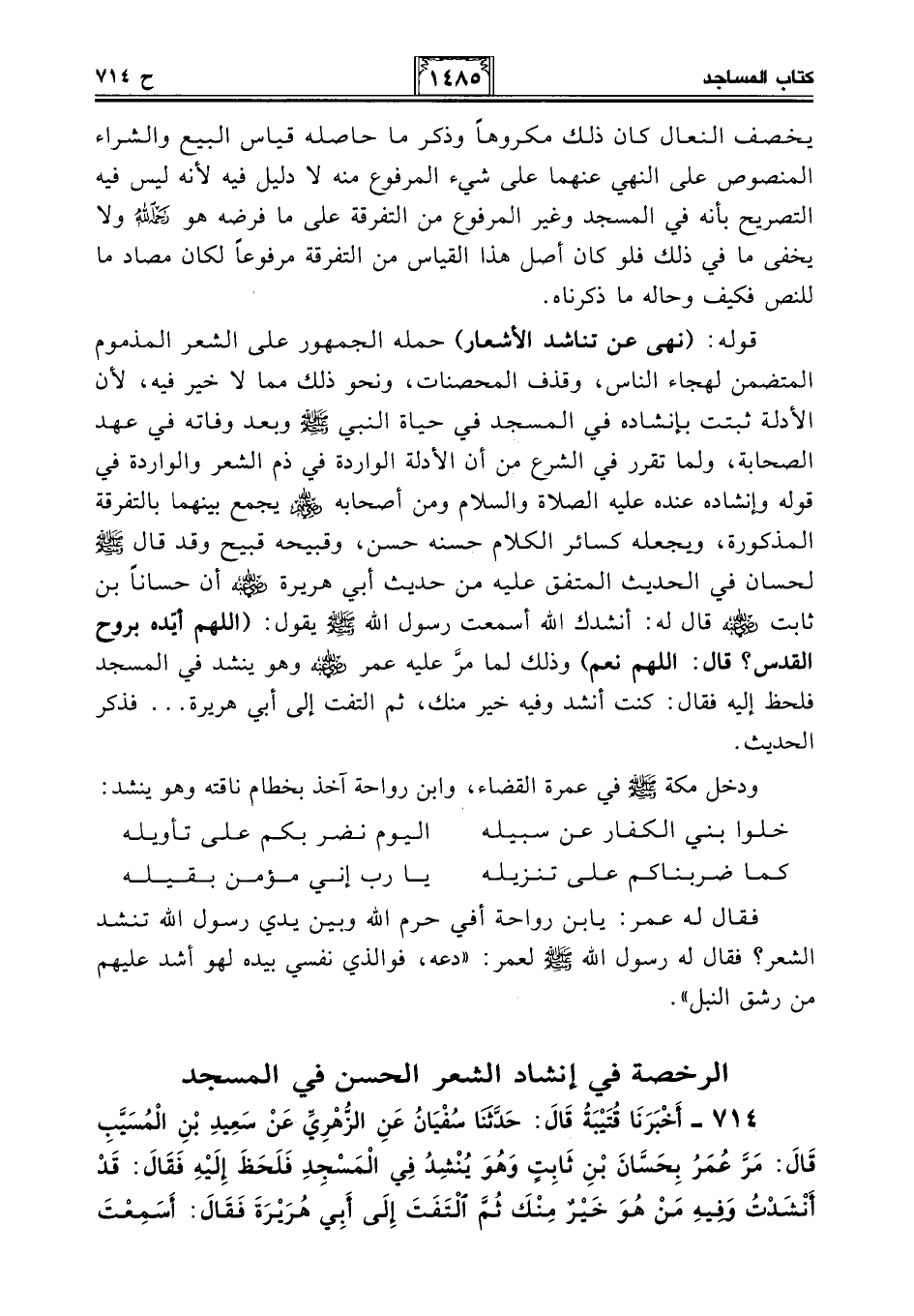قوله: (نهى عن تناشد الأشعار) حمله الجمهور على الشعر المذموم المتضمن لهجاء الناس، وقذف المحصنات، ونحو ذلك مما لا خير فيه، لأن الأدلة ثبتت بإنشاده في المسجد في حياة النبي - صلى الله عليه وسلم - وبعد وفاته في عهد الصحابة، ولما تقرر في الشرع من أن الأدلة الواردة في ذم الشعر والواردة في قوله وإنشاده عنده -عليه الصلاة والسلام- ومن أصحابه -رضي الله عنهم- يجمع بينهما بالتفرقة المذكورة، ويجعله كسائر الكلام حسنه حسن، وقبيحه قبيح وقد قال - صلى الله عليه وسلم - لحسان في الحديث المتفق عليه من حديث أبي هريرة - رضي الله عنه - أن حسانًا بن ثابت - رضي الله عنه - قال له: أنشدك الله أسمعت رسول الله - صلى الله عليه وسلم - يقول: (اللهم أيّده بروح القدس؟ قال: اللهم نعم) وذلك لما مرَّ عليه عمر - رضي الله عنه - وهو ينشد في المسجد فلحظ إليه فقال: كنت أنشد وفيه خير منك، ثم التفت إلى أبي هريرة. . . فذكر الحديث.