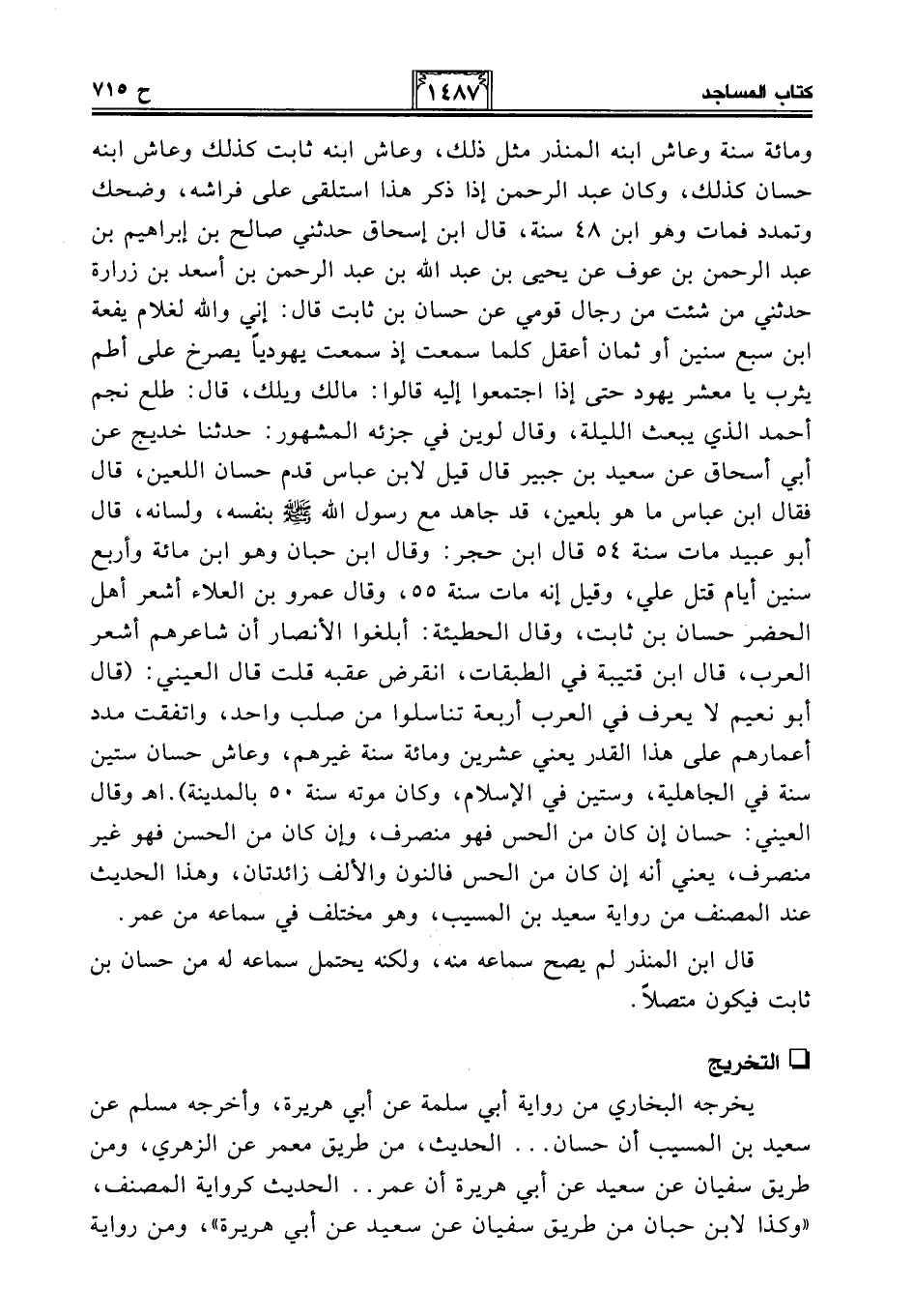 ومائة سنة وعاش ابنه المنذر مثل ذلك، وعاش ابنه ثابت كذلك وعاش ابنه حسان كذلك، وكان عبد الرحمن إذا ذكر هذا استلقى على فراشه، وضحك وتمدد فمات وهو ابن 48 سنة، قال ابن إسحاق حدثني صالح بن إبراهيم بن عبد الرحمن بن عوف عن يحيى بن عبد الله بن عبد الرحمن بن أسعد بن زرارة حدثني من شئت من رجال قومي عن حسان بن ثابت قال: إني والله لغلام يفعة ابن سبع سنين أو ثمان أعقل كلما سمعت إذ سمعت يهوديًا يصرخ على أطم يثرب يا معشر يهود حتى إذا اجتمعوا إليه قالوا: مالك ويلك، قال: طلع نجم أحمد الذي يبعث الليلة، وقال لوين في جزئه المشهور: حدثنا خديج عن أبي إسحاق عن سعيد بن جبير قال قيل لابن عباس قدم حسان اللعين، قال فقال ابن عباس ما هو بلعين، قد جاهد مع رسول الله - صلى الله عليه وسلم - بنفسه، ولسانه، قال أبو عبيد مات سنة 54 قال ابن حجر: وقال ابن حبان وهو ابن مائة وأربع سنين أيام قتل علي، وقيل إنه مات سنة 55، وقال عمرو بن العلاء أشعر أهل الحضر حسان بن ثابت، وقال الحطيئة: أبلغوا الأنصار أن شاعرهم أشعر العرب، قال ابن قتيبة في الطبقات، انقرض عقبه قلت قال العيني: (قال أبو نعيم لا يعرف في العرب أربعة تناسلوا من صلب واحد، واتفقت مدد أعمارهم على هذا القدر يعني عشرين ومائة سنة غيرهم، وعاش حسان ستين سنة في الجاهلية، وستين في الإِسلام، وكان موته سنة 50 بالمدينة). اهـ وقال العيني: حسان إن كان من الحس فهو منصرف، وإن كان من الحسن فهو غير منصرف، يعني أنه إن كان من الحس فالنون والألف زائدتان، وهذا الحديث عند المصنف من رواية سعيد بن المسيب، وهو مختلف في سماعه من عمر.
