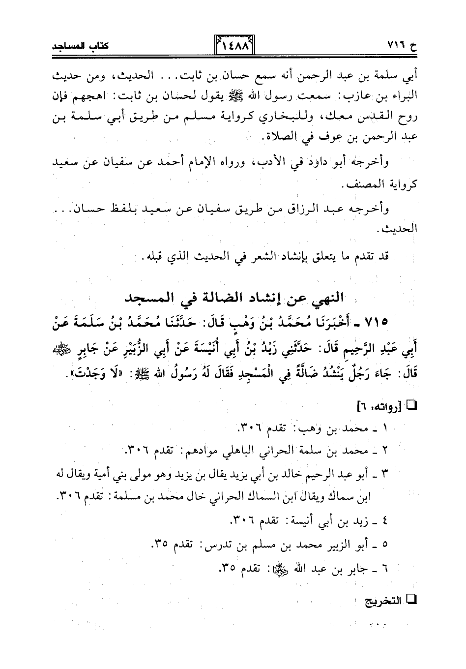 715 - أَخْبَرَنَا مُحَمَّدُ بْنُ وَهْبٍ قَالَ: حَدَّثَنَا مُحَمَّدُ بْنُ سَلَمَةَ عَنْ أَبِي عَبْدِ الرَّحِيمِ قَالَ: حَدَّثَنِي زَيْدُ بْنُ أَبِي أُنَيْسَةَ عَنْ أَبِي الزُّبَيْرِ عَنْ جَابِرٍ - رضي الله عنه - قَالَ: جَاءَ رَجُلٌ يَنْشُدُ ضَالَّةً فِي الْمَسْجِدِ فَقَالَ لَهُ رَسُولُ اللَّهِ - صلى الله عليه وسلم -: "لَا وَجَدْتَ".