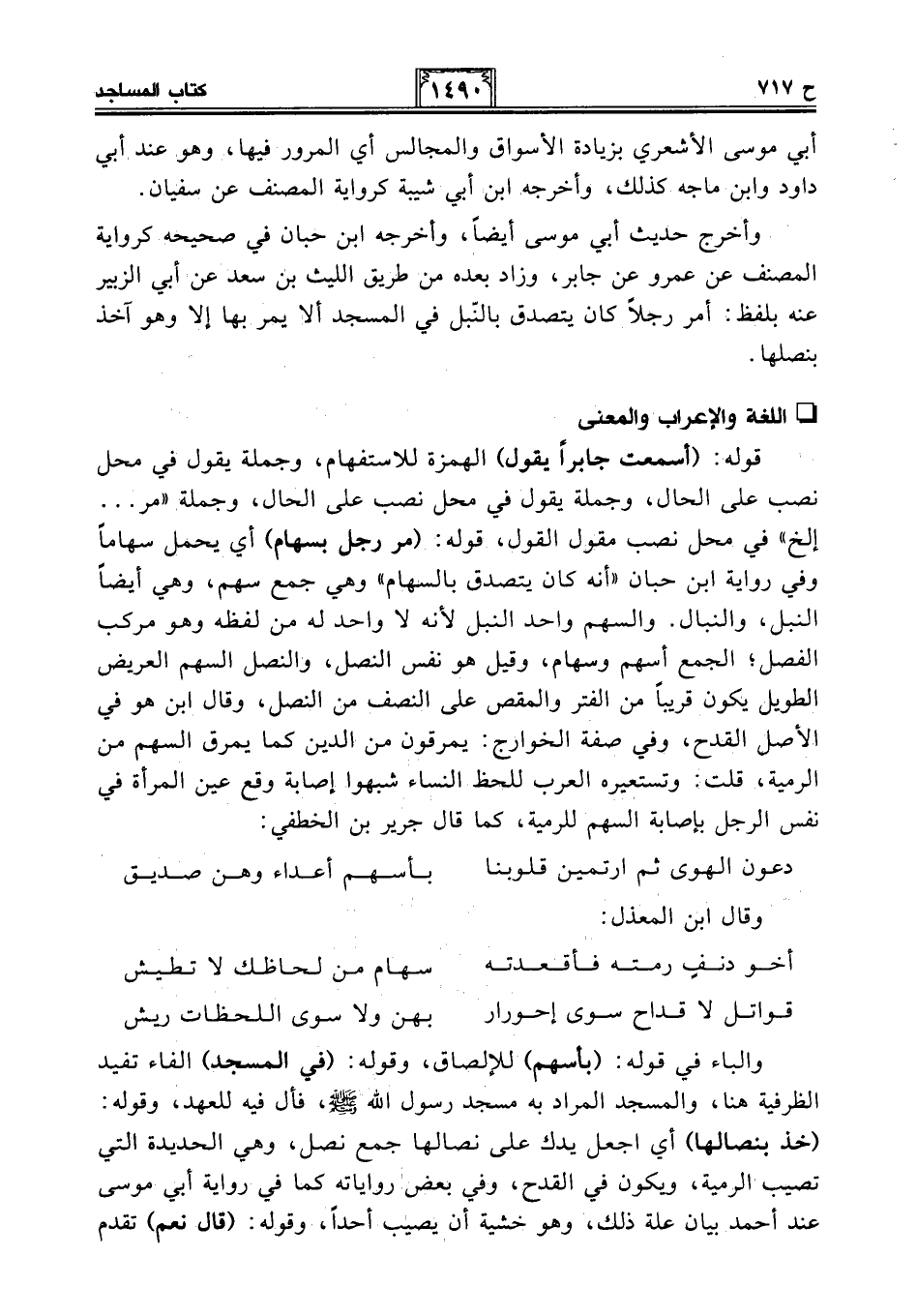 والباء في قوله: (بأسهم) للإلصاق، وقوله: (في المسجد) الفاء تفيد الظرفية هنا، والمسجد المراد به مسجد رسول الله - صلى الله عليه وسلم -، فأل فيه للعهد، وقوله: (خذ بنصالها) أي اجعل يدك على نصالها جمع نصل، وهي الحديدة التي تصيب الرمية، ويكون في القدح، وفي بعض رواياته كما في رواية أبي موسى عند أحمد بيان علة ذلك، وهو خشية أن يصيب أحدًا، وقوله: (قال نعم) تقدم