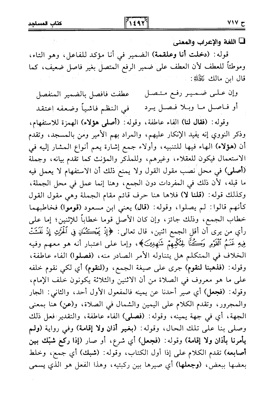 وقوله: (فقال لنا) الفاء عاطفة، وقوله: (أصلى هؤلاء) الهمزة للاستفهام، وذكر النووي إنه يفيد الإنكار عليهم، والمراد بهم الأمير ومن بالمسجد، وتقدم أن (هؤلاء) الهاء فيها للتنبيه، وأولاء جمع إشارة يعم أنواع المشار إليه في الاستعمال فيكون للعقلاء، وغيرهم، وللمذكر والمؤنث كما تقدم بيانه، وجملة (أصلى) في محل نصب مقول القول ولا يمنع ذلك أن الاستفهام لا يعمل فيه ما قبله، لأن ذلك في المفردات دون الجمع، وهنا إنما عمل في محل الجملة، وكذلك قوله: (قلنا لا) فلا هاهنا حرف قائم مقام الجملة وهي مقول القول كأنهم قالوا: لم يصلوا، وقوله: (قال) يعني ابن مسعود (قوموا) فخاطبهما خطاب الجمع، وذلك جائز، وإن كان الأصل قوما خطابًا للإثنين؛ إما على رأي من يرى أن أقل الجمع اثنين، قال تعالى: {إِذْ يَحْكُمَانِ فِي الْحَرْثِ إِذْ نَفَشَتْ فِيهِ غَنَمُ الْقَوْمِ وَكُنَّا لِحُكْمِهِمْ شَاهِدِينَ}، وإما على اعتبار أنه هو معهم وفيه الخلاف في المتكلم هل يتناوله الأمر الصادر منه، (فصلوا) الفاء عاطفة، وقوله: (فذهبنا لنقوم) جرى على صيغة الجمع، و (لنقوم) أي لكي نقوم خلفه على ما هو معروف في الصلاة من أن الاثنين والثلاثة يكونون خلف الإِمام، وقوله: (فجعل) أي صير أحدنا عن يمينه فالمفعول الأول أحد، والثاني: الجار والمجرور، وتقدم الكلام على اليمين والشمال في الصلاة، و (عن) هنا بمعنى الجهة، أي في جهة يمينه، وقوله: (فصلى) الفاء عاطفة، والتقدير فعل ذلك وصلى بنا على تلك الحال، وقوله: (بغير أذان ولا إقامة) وفي رواية (ولم يأمرنا بأذان ولا إقامة) وقوله: (فجعل) أي شرع، أو صار (إذا ركع شبّك بين أصابعه) تقدم الكلام على إذا أول الكتاب، وقوله: (شبك) أي جمع، وخلط بعضها ببعض، (وجعلها) أي صيرها بين ركبتيه، وهذا الفعل هو الذي يسمى