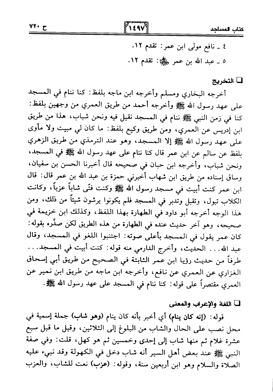 أخرجه البخاري ومسلم وأخرجه ابن ماجه بلفظ: كنا ننام في المسجد على عهد رسول الله - صلى الله عليه وسلم - وأخرجه أحمد من طريق العمري من وجهين بلفظ: كنا في زمن النبي - صلى الله عليه وسلم - ننام في المسجد نقيل فيه ونحن شباب، هذا من طريق ابن إدريس عن العمري، ومن طريق وكيع بلفظ: ما كان لي مبيت ولا مأوى على عهد رسول الله - صلى الله عليه وسلم - إلا المسجد، وهو عند الترمذي من طريق الزهري بلفظ عن سالم عن ابن عمر قال كنا ننام على عهد رسول الله - صلى الله عليه وسلم - في المسجد، ونحن شباب، وأخرجه ابن حبان في صحيحه قال أخبرنا الحسن بن سفيان، وساق إسناده من طريق ابن شهاب أخبرني حمزة بن عبد الله بن عمر قال: قال ابن عمر كنت أبيت في مسجد رسول الله - صلى الله عليه وسلم - وكنت فتًى شابًا عزبًا، وكانت الكلاب تبول، وتقبل وتدبر في المسجد فلم يكونوا يرشون شيئًا من ذلك، ومن هذا الوجه أخرجه أبو داود في الطهارة بهذا اللفظ، وكذلك ابن خزيمة في صحيحه، وهو آخر حديث عنده في الطهارة من هذه الطريق لكن صدَّره بقوله: كان عمر يقول في المسجد بأعلى صوته: اجتنبوا اللغو في المسجد، وقال عبد الله. . . الحديث، وأخرج الدارمي منه قوله: كنت أبيت في المسجد. . . طرفًا من حديث رؤيا ابن عمر الثابتة في الصحيح من طريق أبي إسحاق الغزاري عن العمري عن نافع، وأخرجه ابن ماجه من طريق ابن نمير عن العمري مقتصرًا على قوله: كنا ننام في المسجد على عهد رسول الله - صلى الله عليه وسلم -.